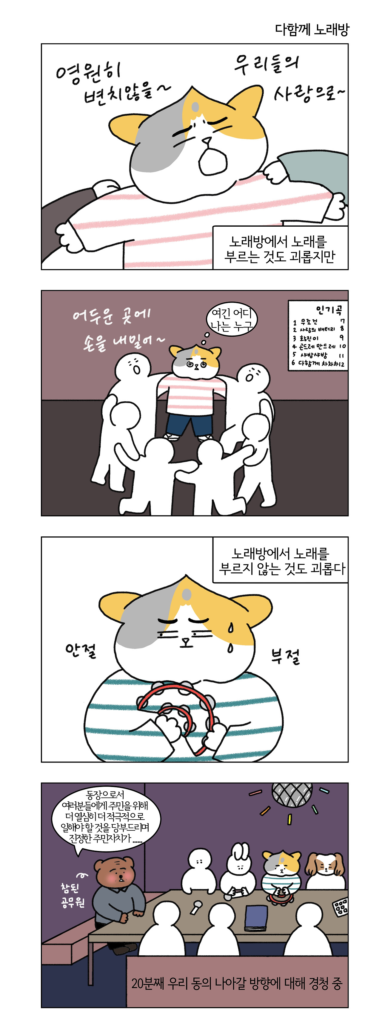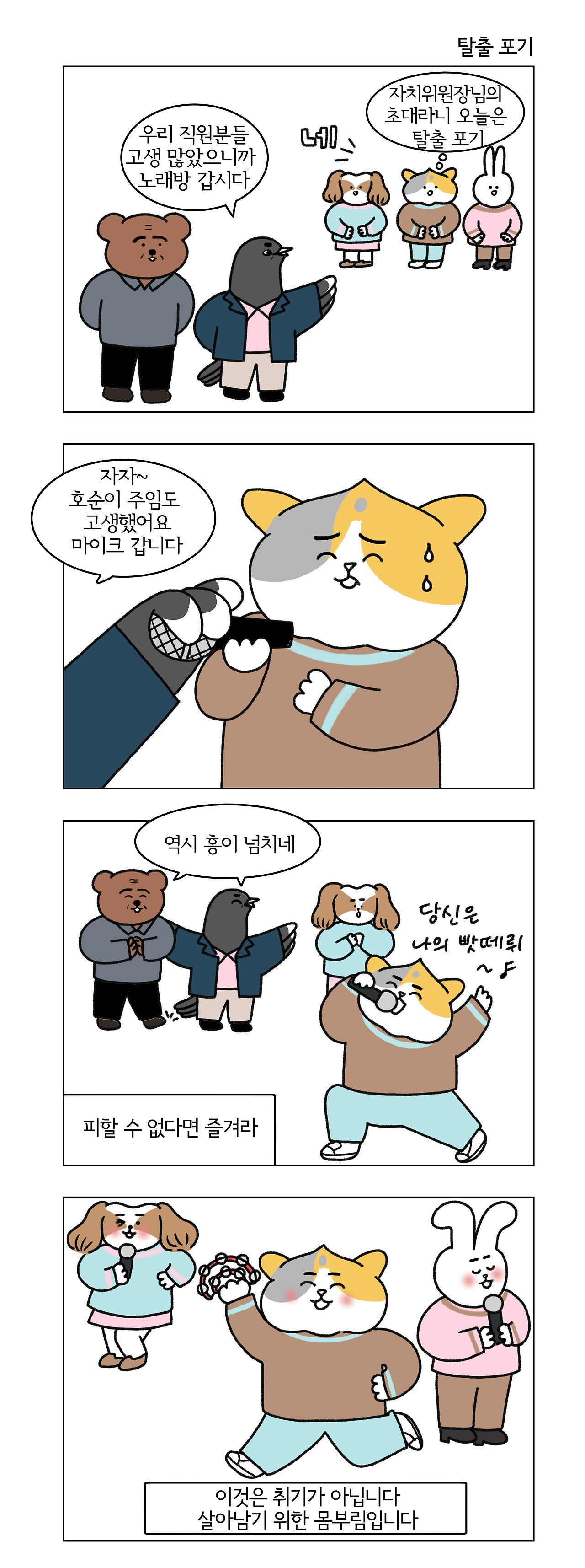 사람이라면 술도 마시고 실수도 하고 남의 인생에 참견도 할 수 있지 않은가? 공무원이 무슨 로봇도 아니고 그런 것까지 뭐라 하면 너무 인간미가 없지 않냐고 할 수도 있다. 그래도 끝까지 참기 힘든 한 가지가 있다. 왜 회식의 끝은 항상 노래방이란 말인가? 공무원도 대한민국 국민이니 한민족의 흥을 누가 말릴 수 있을까 싶다. 시끄러운 장소도 질색인 데다 노래까지 못 부르는 나는 노래방에 갈 때마다 울상이었다. 팀장님의 소울 넘치는 트로트 열창을 들으며 왜 나는 흥의 나라에서 태어났는지 핀란드 같은 나라에서 태어났으면 좋았을텐데 하며 뜬금없이 국적에 대한 고찰을 했다. 분위기는 깨기 싫어 팔이 아플 정도로 탬버린을 흔들다가 끝도 없이 서비스를 넣어주는 노래방 사장님을 미워하기도 했다.