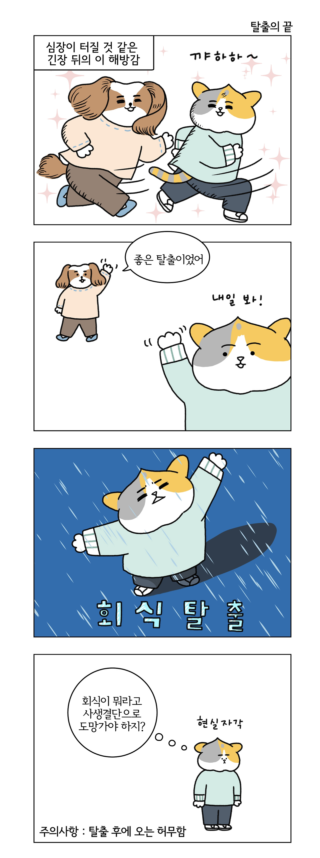 다행히 내가 겪은 공무원의 회식에도 장점이 있었다. 동에 따라 다르지만 그 빈도가 아주 자주는 아니라는 것. 단순히 상사의 기분을 맞추기 위해 전체 회식을 강행하는 비민주적인 일은 일어나지 않는 것. 그리고 도주의 자유가 어느 정도 인정된다는 점이다. 회식 때 도망갔다고 동장님한테 찍혀서 승진을 못하거나 그런 일은 없다. 신규티를 벗어나면서 나는 프로 회식 탈주범으로 거듭났다. 내가 살길은 탈출뿐이었다.