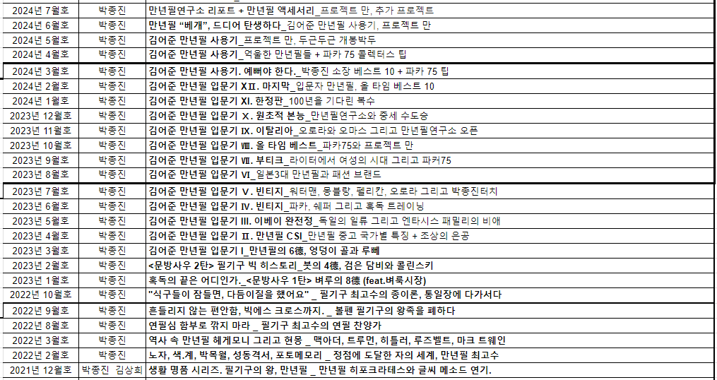 그리고 만년필이 생각보다 좋은 취미라는 점(격한 활동이 아니라 다치지 않고, 일정 수준을 넘는 만년필을 구입하지 않는다면 많은 자본이 필요하지 않으며, 필사로 정신수양도 할 수 있고, 좋은 만년필의 경우 환금성도 나쁘지 않다는 점 등등 ㅎㅎ)에 다른 사람들에게도 권할만한 취미라고 생각했습니다. 그래서 관련 자료를 정리하고, 만년필 관련 정보를 알게 된 과정들을 복기하여 기록을 남기고 싶다는 생각이 들었습니다.