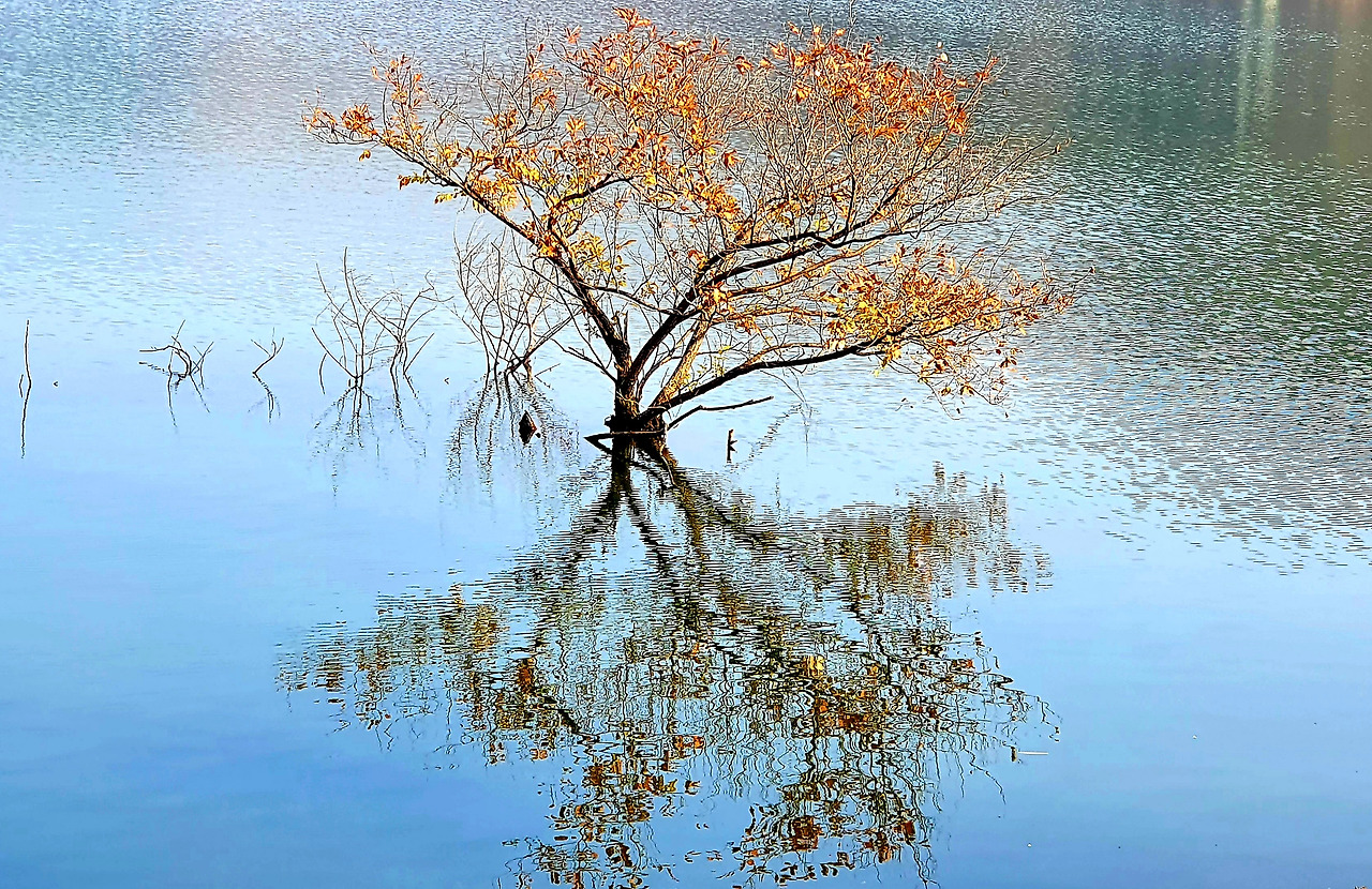 잔물결 위로 새 한 마리가 물보라를 일으키며 미끄러진다. 흡사 착륙하는 동체의 모습 같다. 가을도 기우는 호숫가, 수몰 때 잠긴 나무들이 용케 견뎌 물속 깊이 뿌리를 내리고 수면 위에 데칼코마니를 만든다.