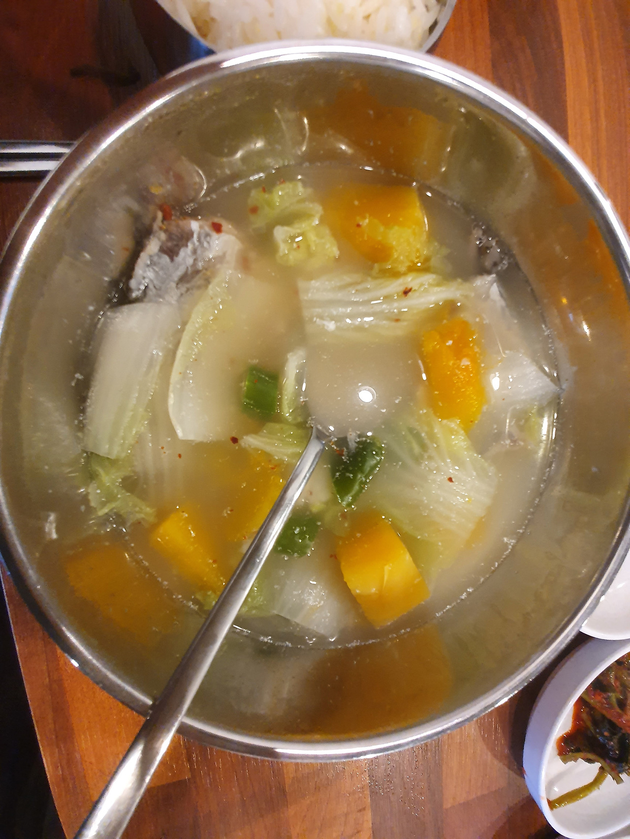 맑은 국물에 봄동 데친 것과 노란 호박이 어우러지니 일단 색감에서 식욕이 동했고 첫 술을 뜨는 순간 우린 셋다 눈을 동그랗게 뜨고 잠시 서로를 바라보다 흡입하듯 그야말로 뚝딱 해치웠다.