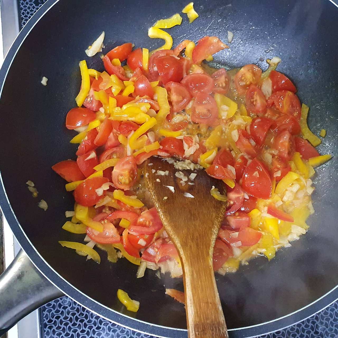 1)통마늘을 채 썰어 노랗게 볶고 파프리카도 예쁘게 썰어서 살짝 볶고 토마토는 4등분 하여 볶고 위 재료를 한데 섞은 후 파스타 소스를 부어 한번 볶아준 후