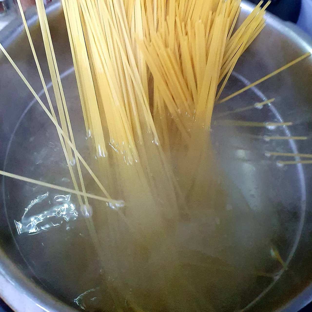 2) 끓는 물에 11분 정도 삶은 파스타를 바구니에 건진 후 물기를 탈탈 털어 올리브유로 후다닥 볶은 후