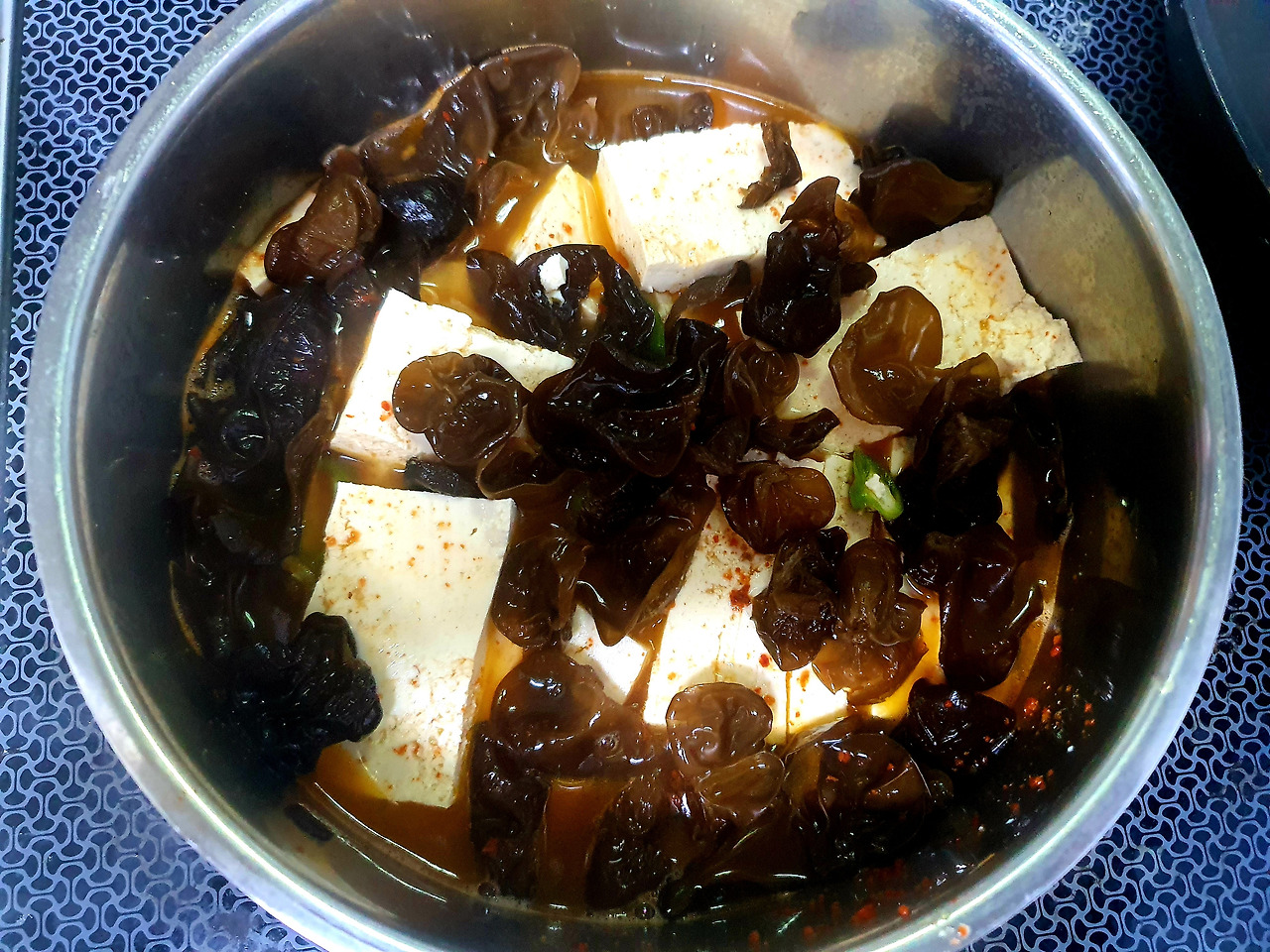 #두부전골 (두부 한모, 목이버섯 불린 것, 청양고추 반개, 들기름 한 숟가락, 고춧가루 조금, 새우젓, 참치액젓, 마늘 다진 것, 실파나 쪽파)