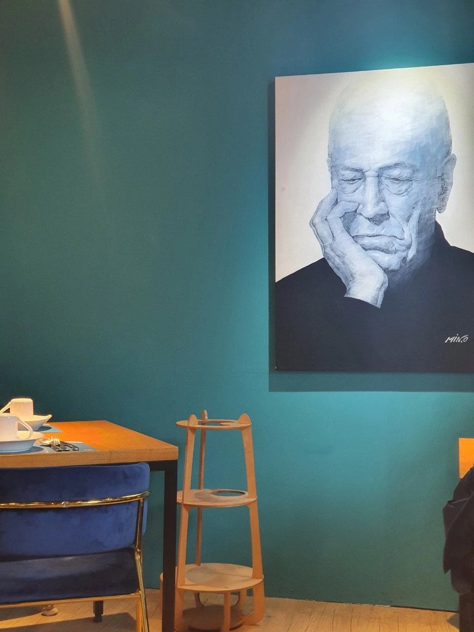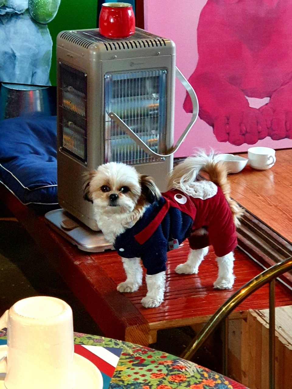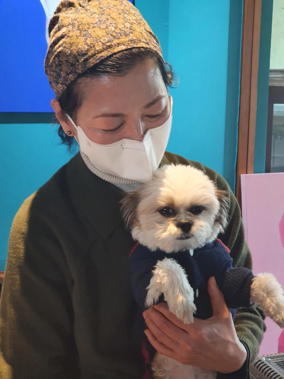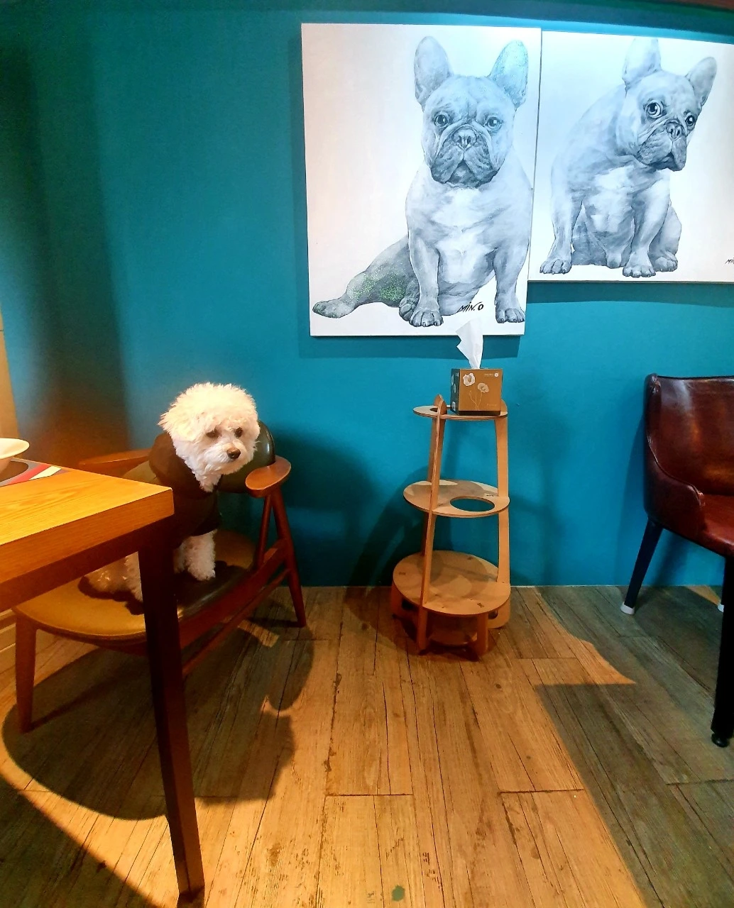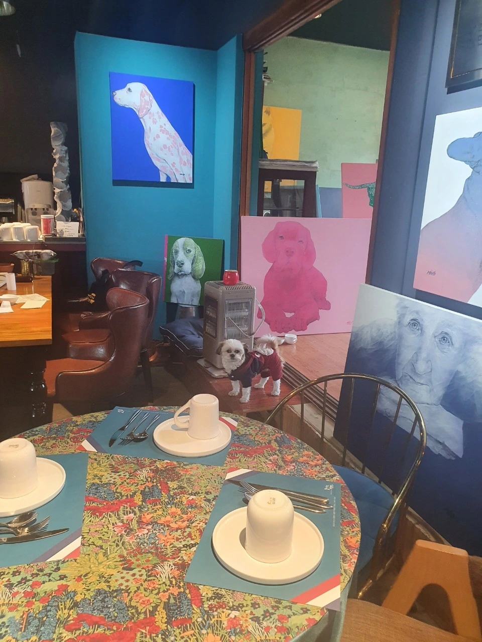 반려견 별과의 동행이었기에 예쁜 자리를 모두 건너뛰고(그렇다고 내가 앉은자리가 나쁘다는 뜻은 아니다) 의자 두 개가 놓인 테이블 가장 구석진 자리에 앉는다.사방은 온통 주인이 그린 그림이 걸려있고, 3살 된 반려견 시추는 작업공간 앞 난로가 놓인 계단에서 새로 온 손님을 맞이한다.