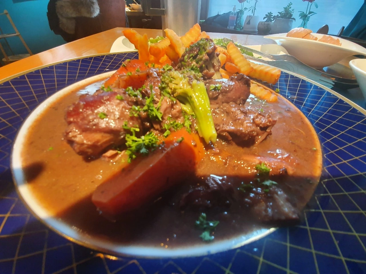나는 여러 가지 메뉴 중 라따투이 빠삐 오뜨(라따뚜이와 쿠스쿠스를 종이 호일에 구운 요리)와, 연어 탈리아텔레(연어 크림소스 파스타), 꼬꼬뱅(Coq au Vin-포도주에 졸인 닭고기와 감자튀김) 사이에서 오초쯤 망설이다 꼬꼬뱅을 주문한다.