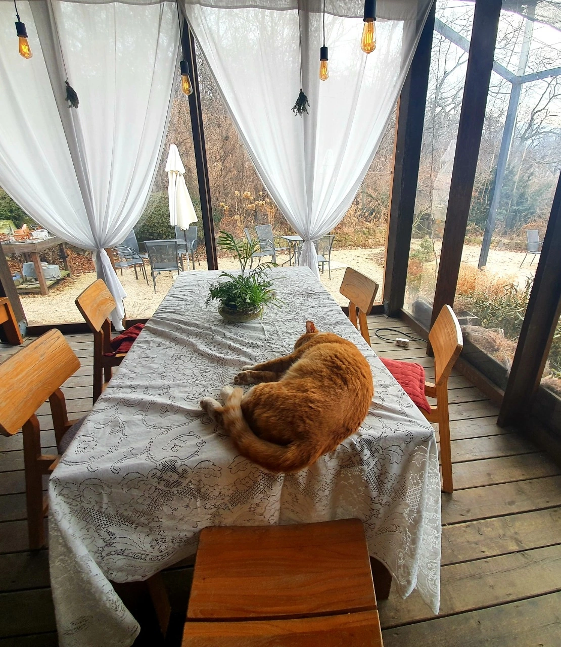 바깥경치가 훤히 내다보이는 자리에 샤랄라 하얀 커튼이 햇살을 흡수하고 남은 여분을 테이블 위에 올려둔다. 개냥이 살구는 천연덕스럽게 그 테이블을 차지하고 누워, 치명적 애교로 시선을 끌어당긴다. 별이는 내 곁에 바싹 붙어 앉아 살구를 바라보며 끙끙 앓는 소리를 내고, 나는 나의 내면 깊이 빠져 들어간다. 햇살이 서편을 기웃거릴 즈음 테이블 위엔 빈커피잔 세 개가 나란하고, 원고는 볼펜 자국으로 새까맣게 그을려있다.