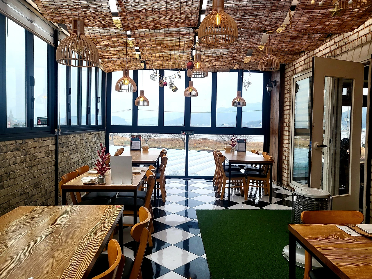 환하게 웃으며 반기는 사장님의 다감한 목소리에친척집인 줄 착각했다. 바둑 문양의 커다란 타일로 된 미끈한 바닥 위에 정갈하게 자리 잡은 테이블과 의자, 커다란 통유리 창밖으로 보이는 풍경은 은유할 것도 없는 한 편의 시다. 별이에게 다정하게 말을 걸어주는 사람들. 백신과 코로나로 찌든 음흉하고 껄끄러운 도시의 기운을 털어내고 새로 만들어진 행성처럼 따뜻한 기운이 전해오는 내부 풍경.