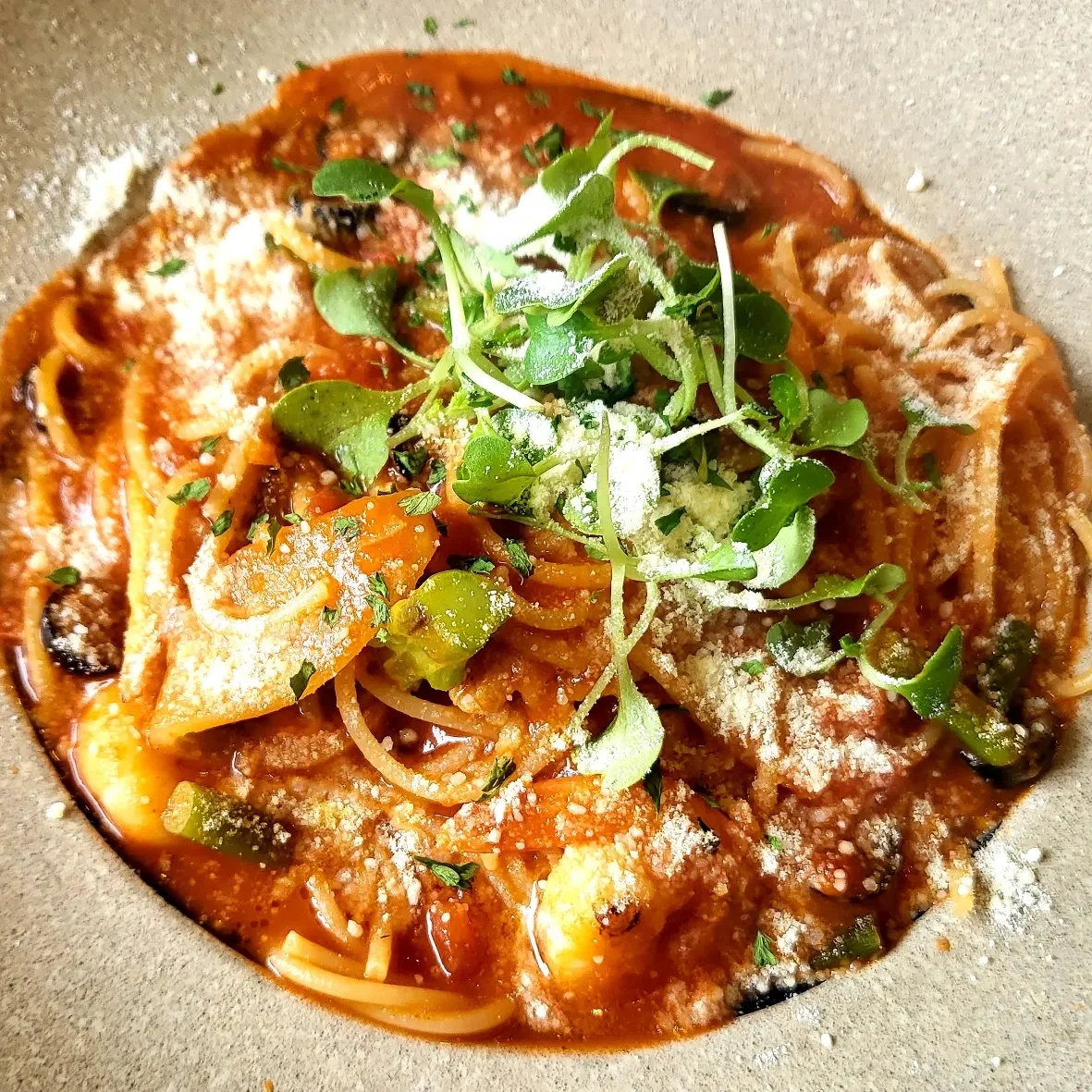 파스타 면을 포크로 당긴 후 스푼에 올려 돌돌 말아 입안 가득 밀어 넣으니, 신선한 토마토의 향이 귀까지 퍼지며 건강한 맛이 온몸으로 스미는 느낌이다. 빨간 토마토답다.