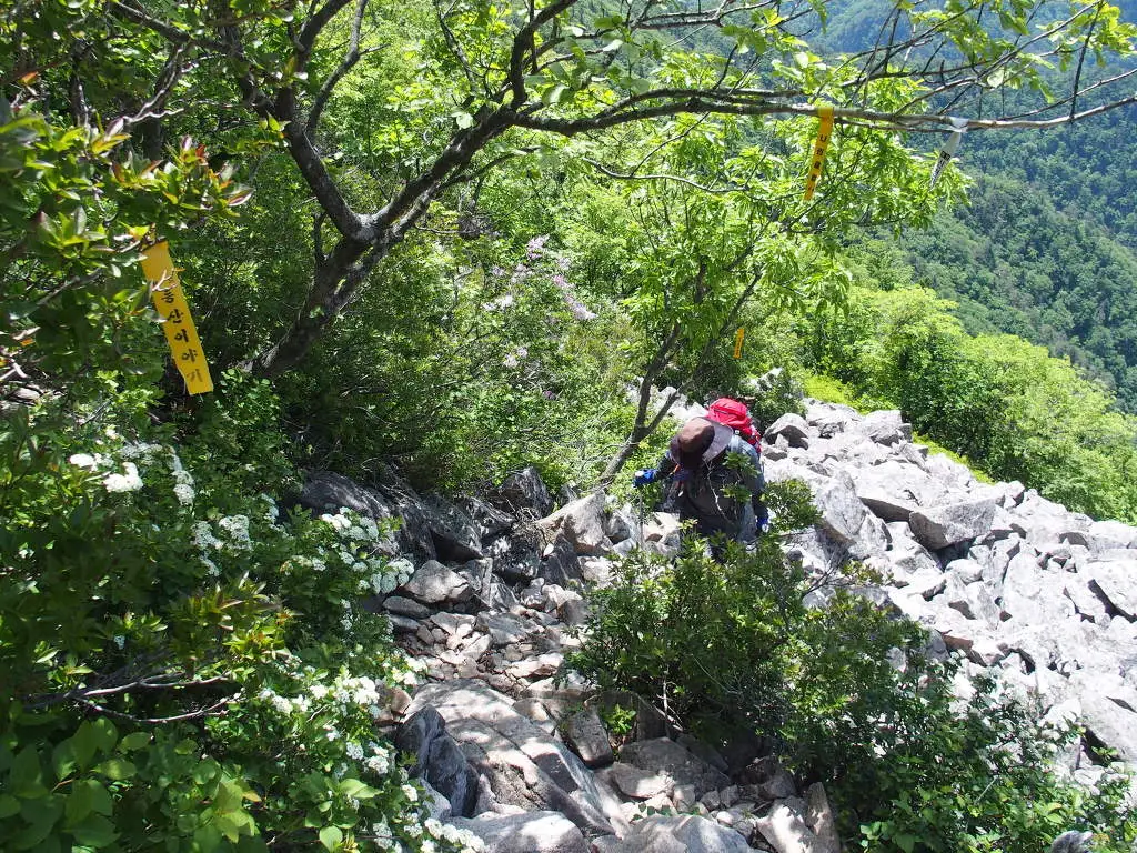 마등봉을 지나 너덜지대를 만난다. 조각 난 바위들이 제멋대로 누워있다. 돌 틈 시이를 잘못 디디면 크게 다치거나 크래바스같은 홀로 추락할 수 있다. 후들거리는 다리 대신 엉덩이로 기기 시작한다.