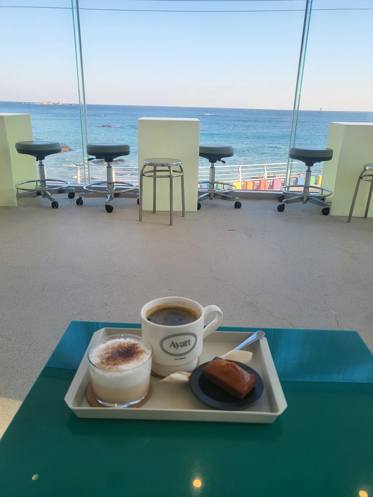 바다 위에 윤슬이 반짝거리기 시작했고 , 나는 오픈런으로 통유리너머 아야진 바다가 가장 예쁘게 보이는 곳에 자리를 잡는다. 따끈한 아메리카노 한 모금에 어질어질 취기가 오르고, 별이는 턱이 다 젖도록 멍푸치노를 흡입한다. 손가락만 한 피낭시애는 먹은 줄도 모르게 사라졌다.