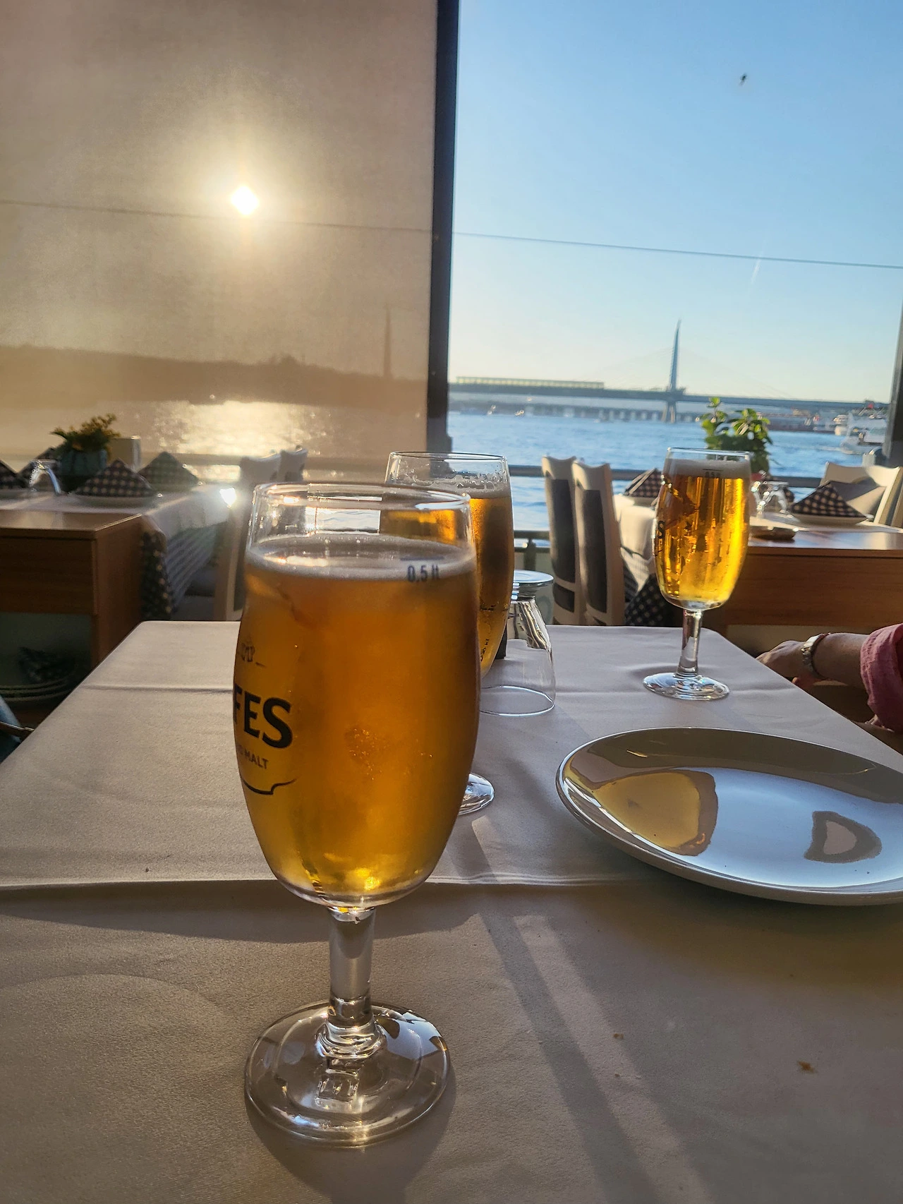 수억 개의 보석이 던져진 것처럼 반짝이는 붉은빛 윤슬조각이 생선비늘처럼 튀어 오르고, 그 빛 사이를 오가는 여행자들의 실루엣이 메두사와 닮았다고 느끼는 순간, '쏴아~~ 치이이익 토독 타다다닥' 입천장에 쏘아 올린 맥주의 시원한 기포가 뭉쳐 목젖을 타고 위장으로 질주한다.
