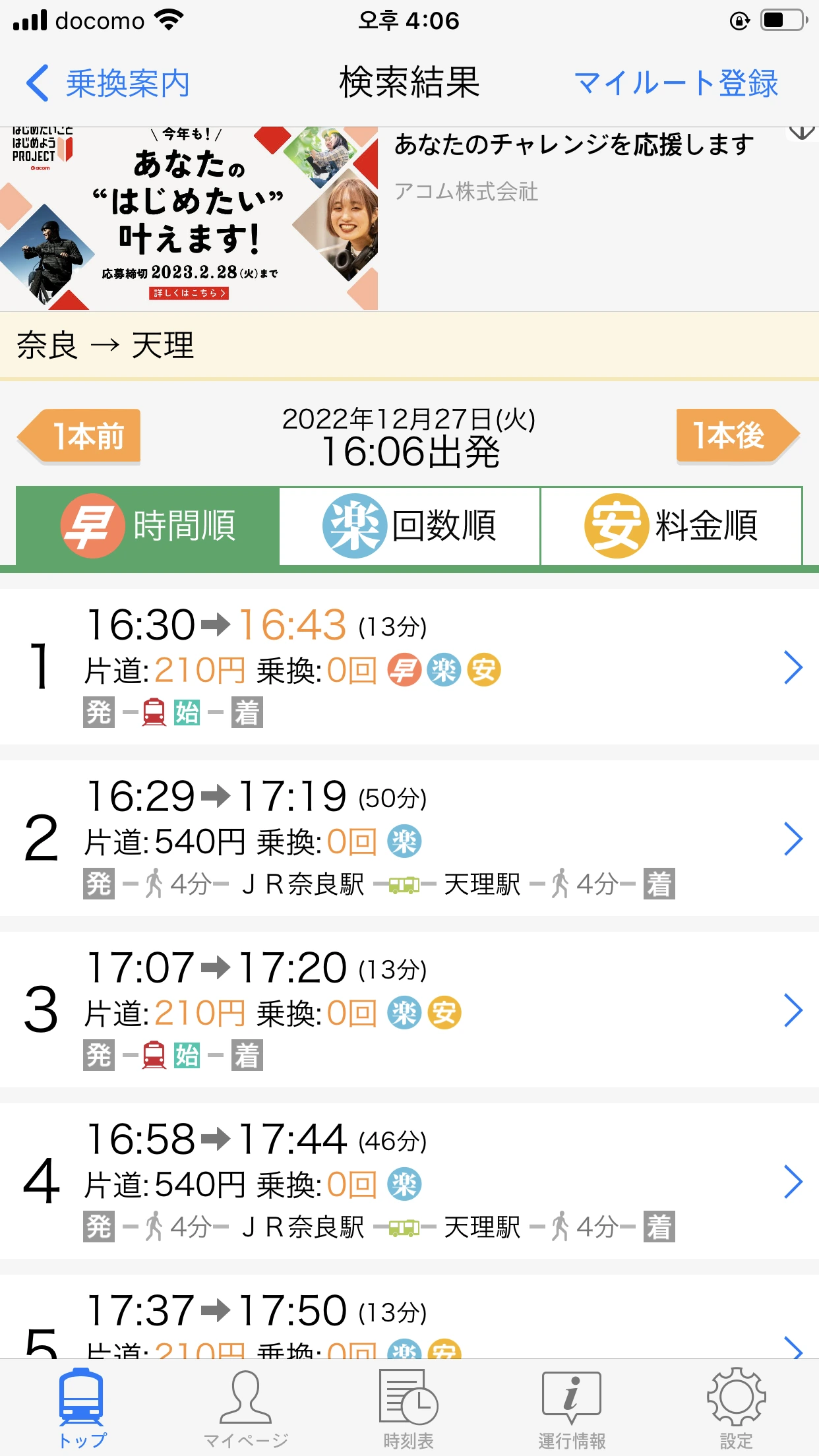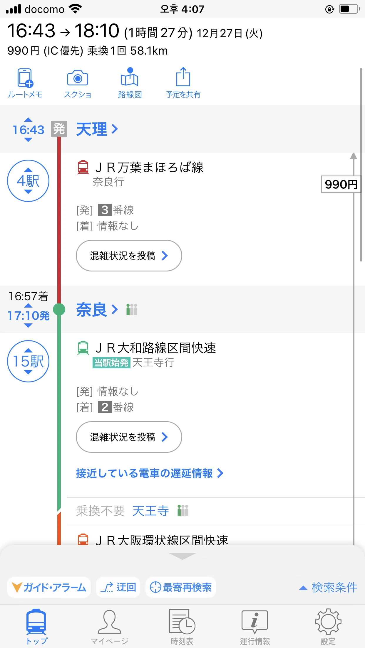 위의 사진은 이해를 조금 더 돕기 위해 방금 나라에서 텐리까지의 경로가 아니라 다른 사진을 들고 왔습니다. 저 사진의 경우, 텐리에서 오사카까지의 경로를 다룬 사진이죠. 자세히 보시면 텐리에서 오사카까지 편도로 990엔(한화 약 9500원)을 지불해야 하고, 시간도 1시간 30분 정도 걸림을 알 수 있습니다.
