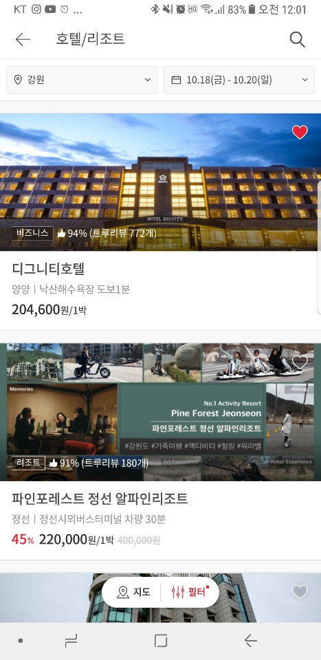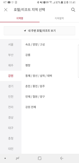 가려는 곳은 호텔이기때문에 당연히 호텔/리조트 카테고리를 선택했다. 그리고 지역은 현재 위치에서 편도 거리(조건 : 편도 3시간)를 계산할 수 없어 서울에서 쉽게 갈 수 있는 강원도로 임의로 선택했다.