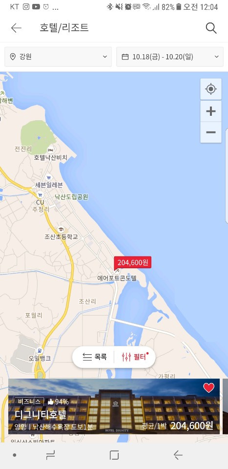 목록/지도를 편하게 왔다갔다 할 수 있다. 호텔을 선택해서 스와이프하면 위치를 바로 알 수 있다.