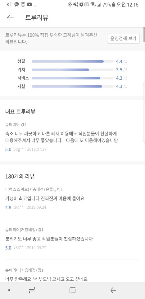 숙박앱에서 리뷰는 중요하다. 얼마나 정확하게 사용자에게 정보를 전달해주는지 그래서 내가 갔을 때 만족할 지등을 미리 살펴볼 수 있다. 먼저 실제 투숙객이 1)얼마나 만족했는지 (퍼센트) 2)청결/위치/서비스/시설 기준으로 얼마나 만족했는지를 살펴볼 수 있었다.