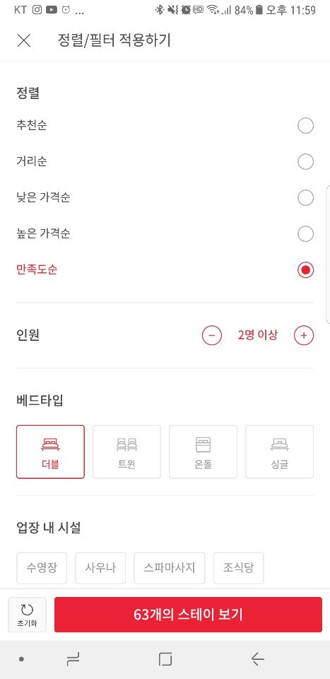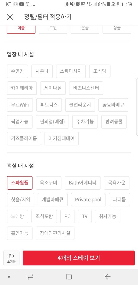 태교 여행이기때문에 베드타입은 [더블], 온수풀이 필요하니 [스파 월풀]을 선택했다. 정렬은 만족도 순으로 했다. 63개에서 4개로 좁혀졌다. 어떤 친구들이 있을까? 가격이 설정이 불가능해서 살짝 무서웠다.