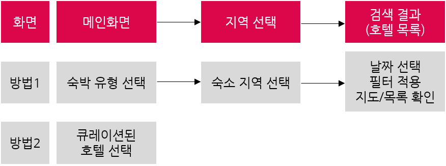 메인화면 -> 지역 선택 -> 검색 목록 및 날짜 선택 -> 호텔 조건 선택 -> 위치 확인 -> 리뷰 확이