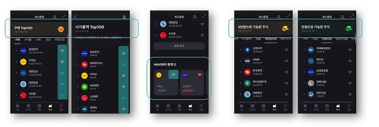 • '5만원으로 가능한 주식', '만원으로 가능한 주식' 정보를 제공하여 주식 개수 보다 < 금액에 초점을 맞춤