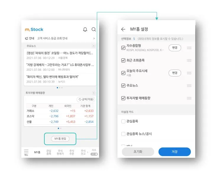 • 메인화면 하단에서 MY홈 편집을 통해 메인화면 정보를 커스터마이징 할 수 있음