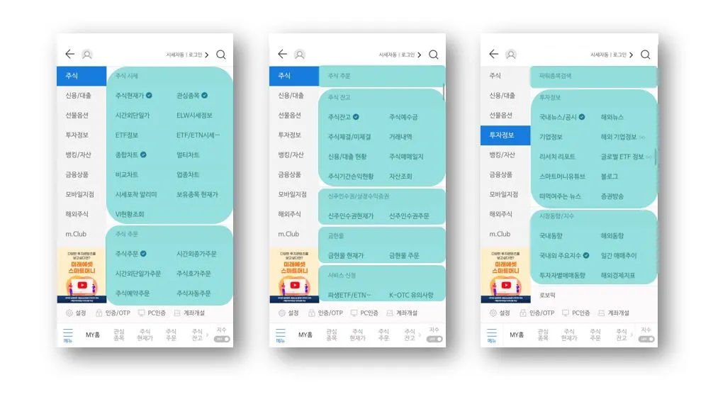 • 메뉴 화면 좌측 카테고리를 보면 [주식, 신용/대출, 선물옵션...] 등의 항목이 잘 정리된 것을 알 수 있음