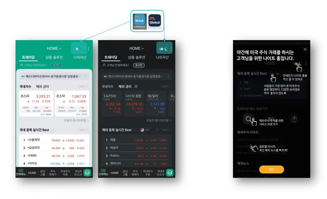 • 국내, 해외 주식 별 따로 어플 설치가 필요한 미래에셋증권(국내장 : m.Stock / 해외장 : m.Global)과 달리 메인화면 우측 상단의 '토글 버튼' 하나로 낮과 밤을 설정하여 국내장과, 미국장을 한 번에 볼 수 있음
