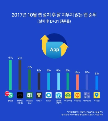 실제 2017년 10월 와이즈 앱에서 실시한 안드로이즈 잔존율 분석 자료를 보면 교통, 금융, 문서 편집 앱들이 순위권에 위치하고 있다. 물론 설치 후 D+31 잔존율이기 때문에 전체적인 관점으로 대입하기는 조금 무리가 있지만 상위권에 위치한 앱들을 살펴보면 동일한 앱 혹은 비슷한 카테고리의 앱들이 이미 설치되어 있어 고개를 끄덕이게 한다.