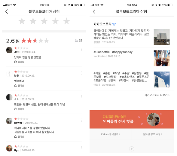 네이버 지도도 블로그 글에서 추출된 한 줄 리뷰를 제공하긴 하지만 광고나 협찬을 배제할 수 없는 블로그보다는 가감없는 사용자 별점이 믿음이간달까..