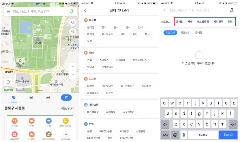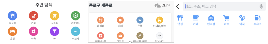 사용 빈도가 높기 때문에 대부분의 지도 앱의 메인과 검색창에는 ‘맛집’이나 ‘카페’ 등 사용자들이 많이 검색하는 카테고리가 기본적으로 제공되며, 카테고리 선택 시 내 위치나 지도 중심으로 카테고리에 해당하는 장소들을 추천해준다.