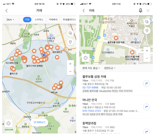 맛집이나 카페의 경우 목적지를 선택하는 데 있어 위치보다는 사용자 리뷰나 메뉴 등이 중요한 기준이기 때문에 리스트에서 후보지들의 부가 정보를 한눈에 비교해볼 수 있는 카카오의 방식이 가장 도움이 된다고 느꼈다. 그 외 병원이나 편의점처럼 거리나 위치가 중요한 장소들은 지도와 함께 표시되는 것이 방식이 적합한 것 같다.