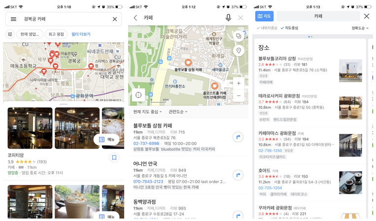 사용자가 미지의 목적지를 결정하는데 가장 도움을 주는 지도 앱이 무엇인지 ‘경복궁 근처의 카페’를 검색하며 사용성과 추천 기준을 비교해보았다.