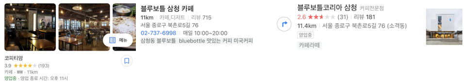 결과적으로 ‘경복궁 주변의 카페 찾기’ 미션의 승리자는 카카오맵이었다. 필자는 별점충이기 때문에 검색 결과에서 다양한 카페의 사용자 평점을 한눈에 확인할 수 있다는 점이 제일 좋았고, 리스트에 대표 사진만 깔끔하게 표시되는 점도 많은 사진이 노출되어 리스트 영역을 잡아먹는 구글보다 마음에 들었다.