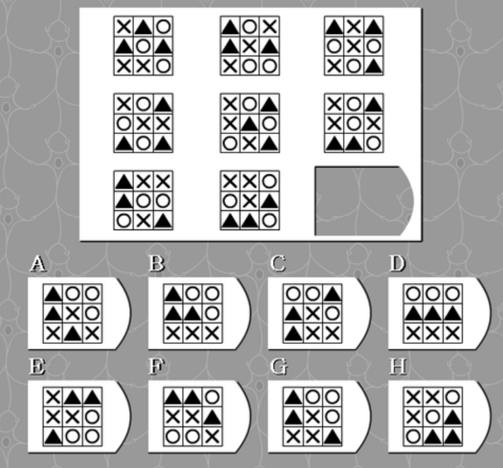 아래의 이미지는 멘사 테스트의 문제라고 떠도는 대표적인 유형인데, 이 글을 읽는 분들이라면 언젠가 한번쯤은 봤을 것이다. 난이도로 보건대 전체 수십 개의 문항 중 초반에 해당하는 문제 수준으로 보인다.