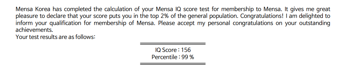 현재 멘사 테스트의 방식이 실제 지능을 가장 잘 대변하는 테스트 방식에라는 점에서 위로(?)가 되긴 한다.