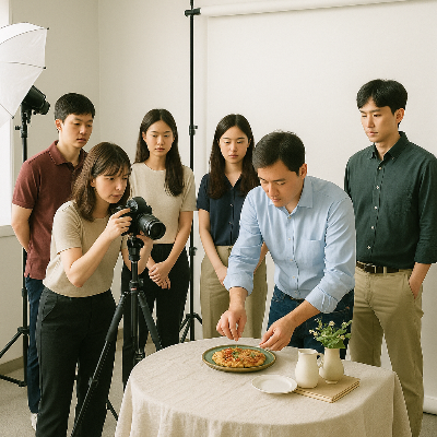 "점심을 좀 빨리 먹고, 촬영 좀 도와줄 수 있을까?"