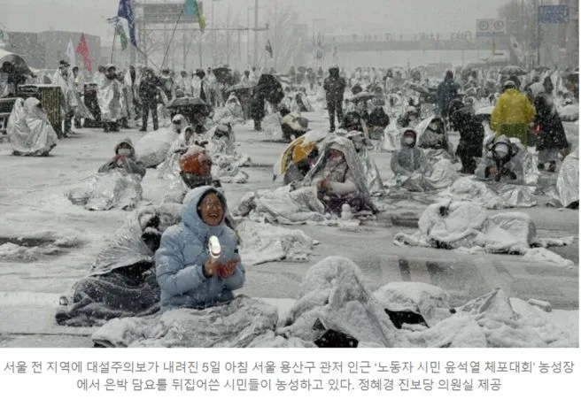기세가 오른 시위대는 다시 내란의 우두머리에 대한 체포영장 집행을 촉구하며 대통령실 관저 인근에서 밤새 시위를 이어갔다. 차가운 냉기가 아스팔트를 타고 올라왔을 법한데 그들은 은박지를 둘러쓴 채 꿈쩍도 하지 않았다. 눈꽃이 밤새 그들의 머리 위로 내려앉았고, 어둠을 뚫고 새날을 맞이한 그들은 키세스 초콜릿을 닮은 ‘키세스 군단’으로 탄생했다.