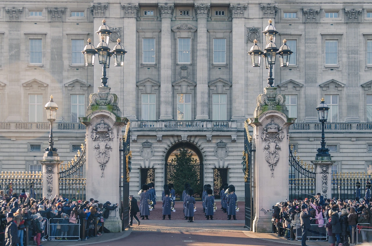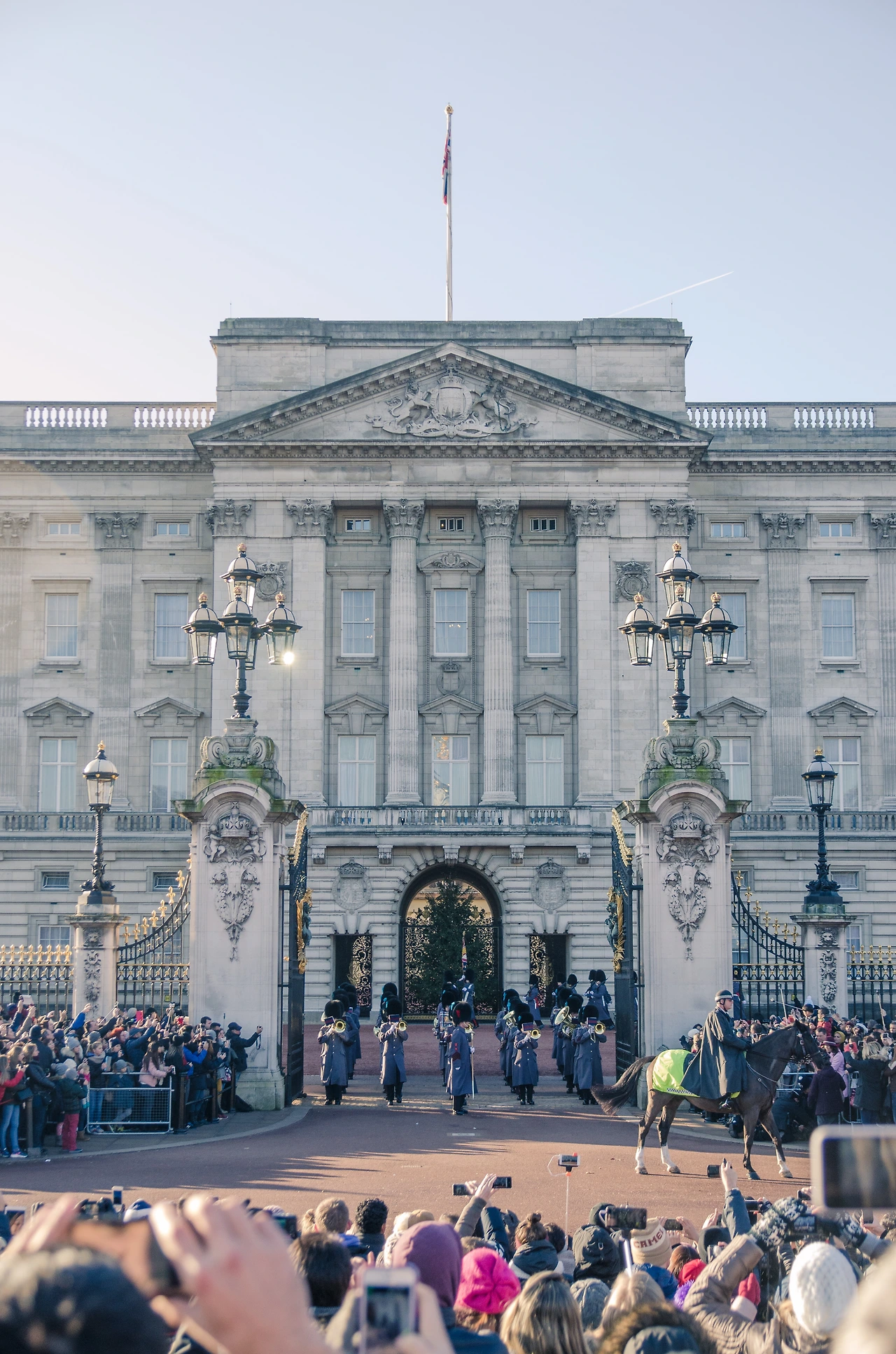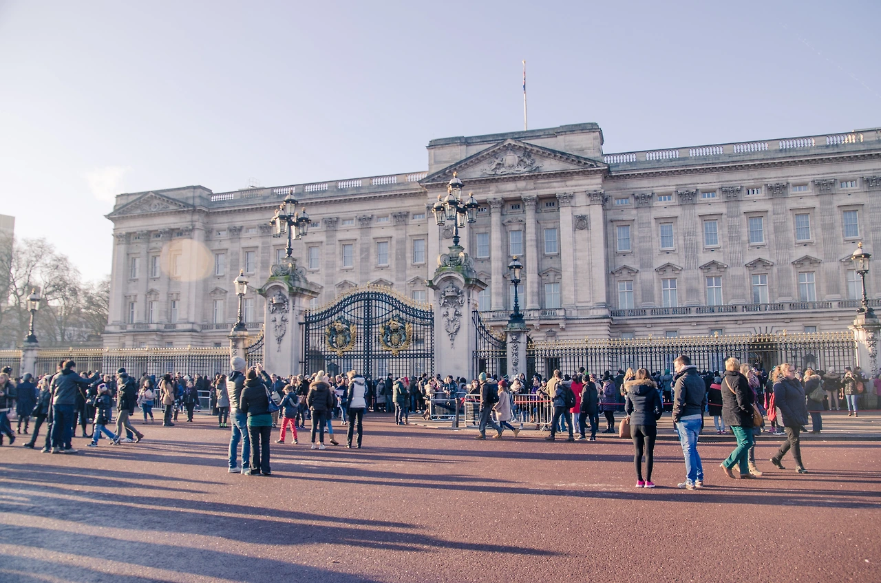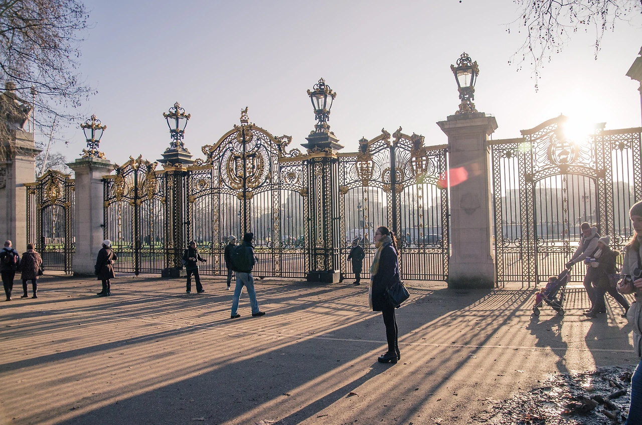 역에서 내려 버킹엄궁을 찾는 일은 생각보다 쉬웠다. 누가봐도 '나 궁전 입구야'라고 써 놓은 듯한 화려한 문이 멀리서부터 나를 압도하고 있었다. 사진으로만 봐도 알 수 있지만 이 날은 눈을 제대로 뜨기 힘들 정도로 햇살이 강렬했다. 여름이었다면 무척 더웠을 날씨였다. 하지만 겨울의 태양은 뜨겁고 덥기보단 강렬하지만 따스한 느낌이었다. 예상했던대로 버킹엄궁 앞에는 많은 사람들이 몰려 근위병 교대식을 보기 위해 이른 시간부터 버킹엄궁 앞을 지키고 있었다.