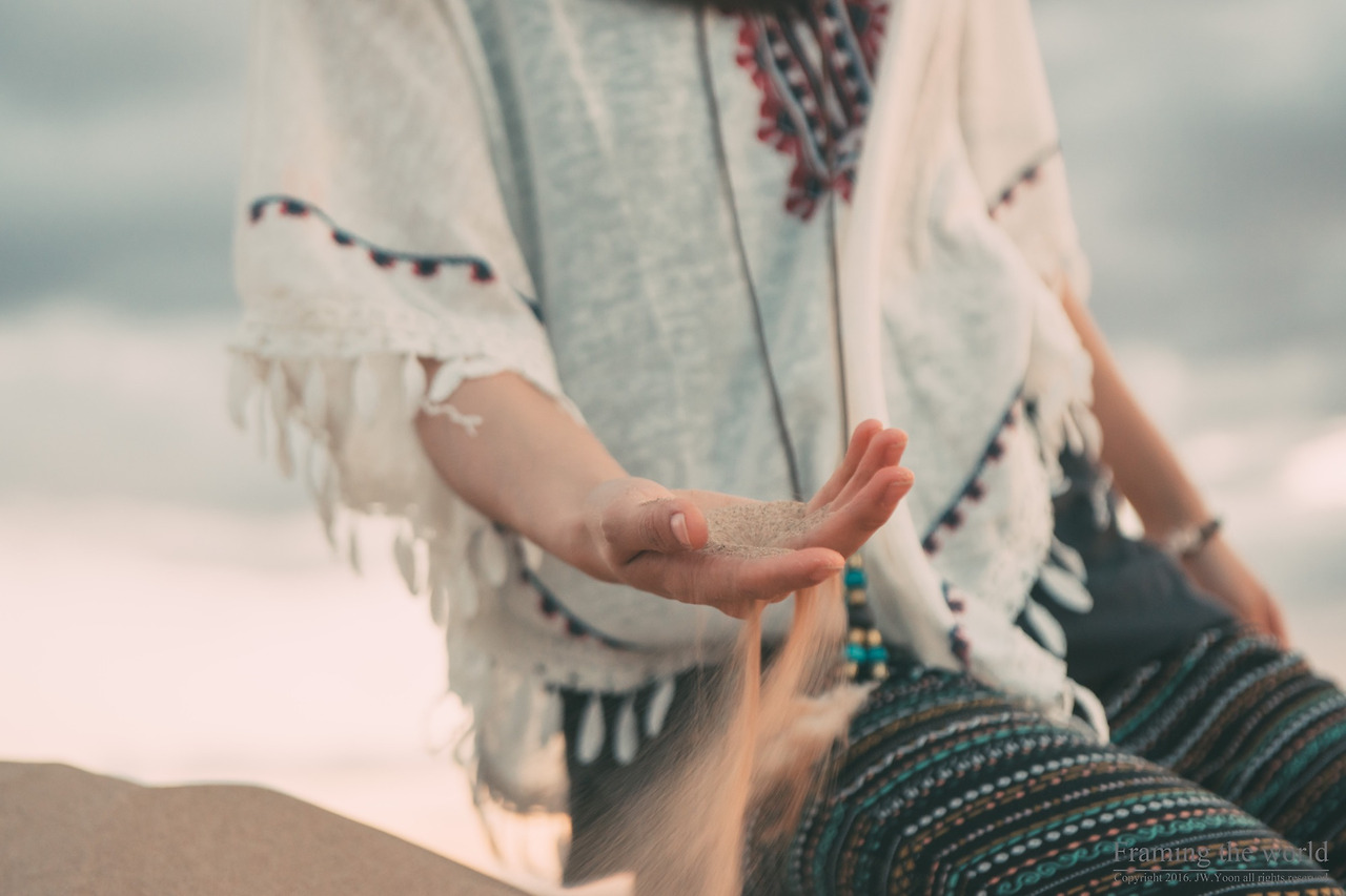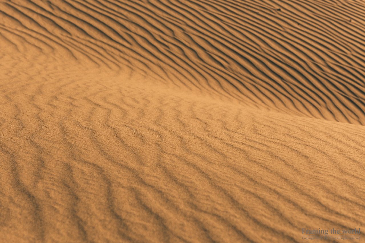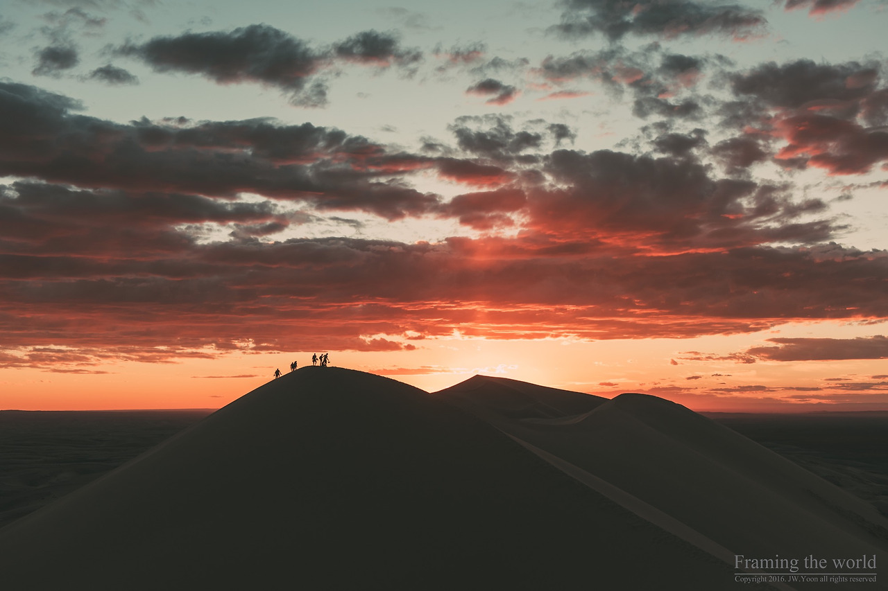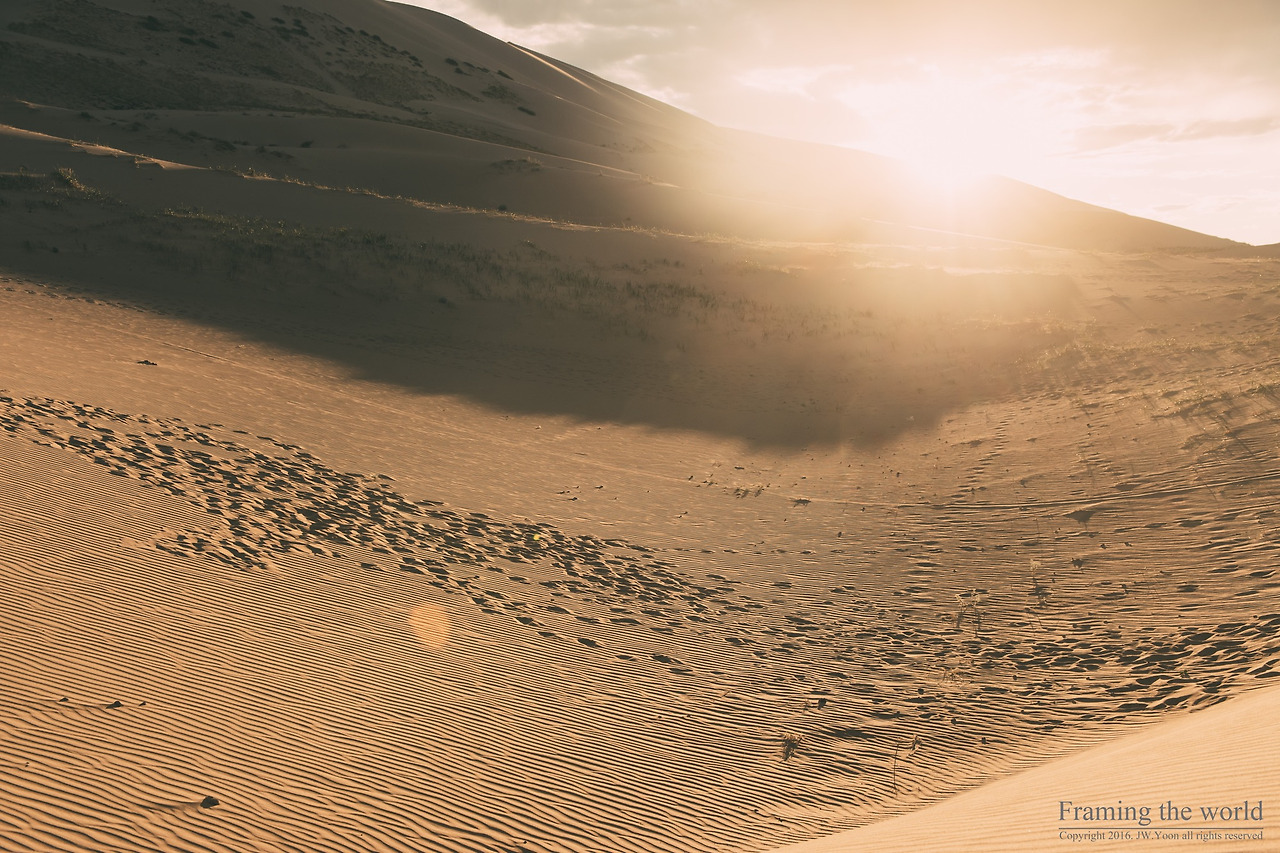 모니터 속 현실감없던 사막의 풍경은 실제로 존재하는 풍경이었다. 케이크에 발린 생크림처럼 매끈하고 예리하게 깎여있는 모래 능선과, 산처럼 보이는 모래 등성이들이 모여 아득하게 펼쳐진 모래 언덕. 바람에 흔들리는 모래의 결과, 물처럼 유연하게 흐르며 내 몸을 감싸는 고운 모래 알갱이 위로 지금껏 태어나 한 번도 본 적 없는 색으로 물들며 저물어가는 태양. 날마다 저물며 죽어가고 새롭게 떠오르는 태양의 기묘한 빛은 그렇게 사막에 명암의 극명한 대비를 주며 비현실성을 더해주고 있었다.