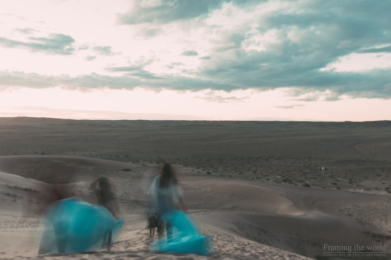 근처에 고도가 높은 곳이라고는 오직 홍고린 엘스라 불리는 언덕밖에 없던 그곳의 꼭대기에 오르자, 눈 앞을 뒤덮고 있던 거대한 모래의 장막은 사라지고 탁 트인 시야가 내 앞을 차지했다. 높은 산에 올라 아래를 내려다보는 것 과는 또 다른 풍경이었다. 몽골의 끝없이 펼쳐진 수평선은 높은 곳에서도 여전히 아득하리만치 끝없이 이어져있었다.
