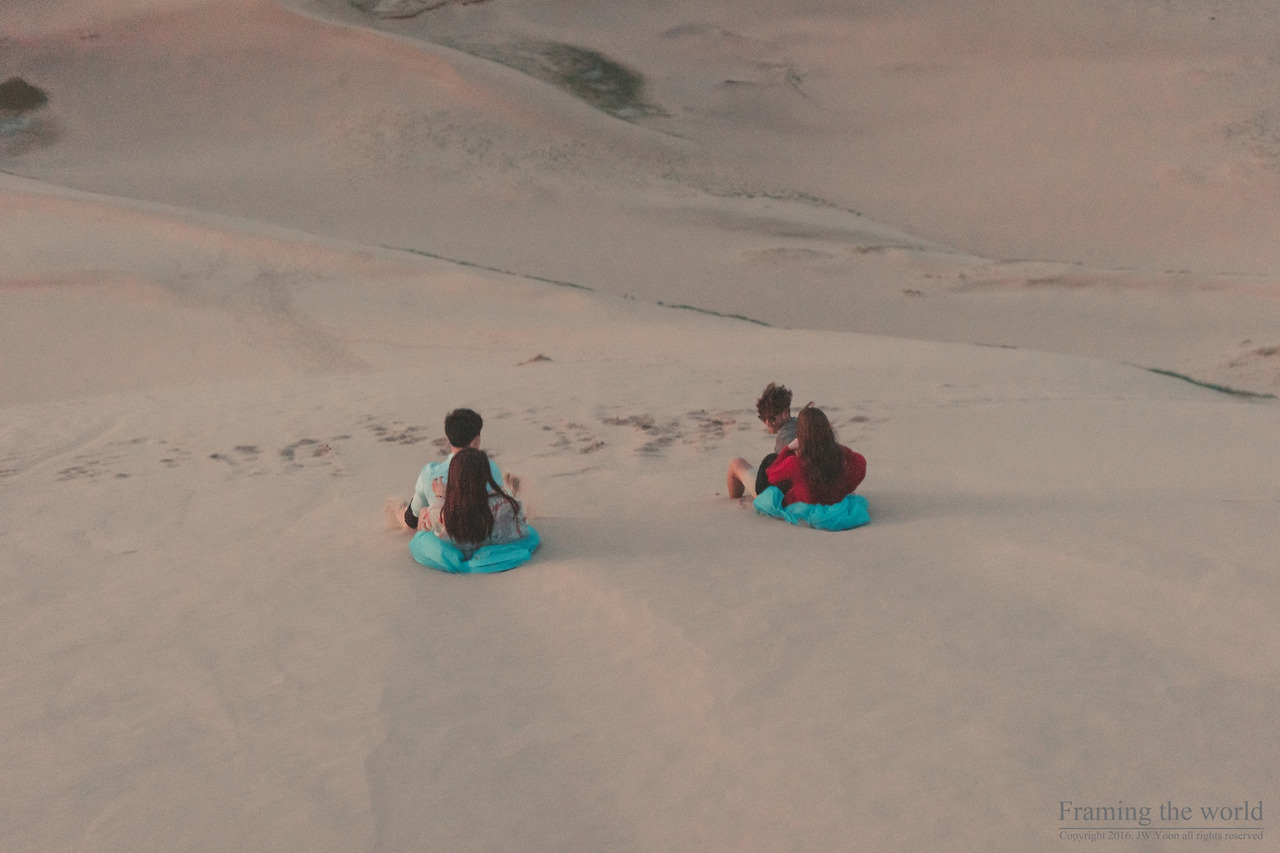사막의 풍경을 한없이 바라보며 감탄하던 우리는 주위가 어두워졌음을 느끼고, 챙겨 온 간이 썰매(?)를 이용해 아래로 내려갔다. 나는 조금 더 발에 와 닿는 모래의 감촉을 느끼고 싶어 맨발로 사막을 내려갔다. 올라올 때는 한없이 힘들었는데, 내려가는 일은 순식간이었다. 아쉽고 억울해서라도 천천히 내려가고 싶은 심정이었다. 모래는 여전히 웅-웅-소리를 내며 울어댔다. 달이 뜬 기묘한 사막을 배경으로 퍽 잘 어울리는 소리라고 생각했다. 내려가기 못내 아쉬웠던 나는 자꾸만 뒤를 돌아봤다.