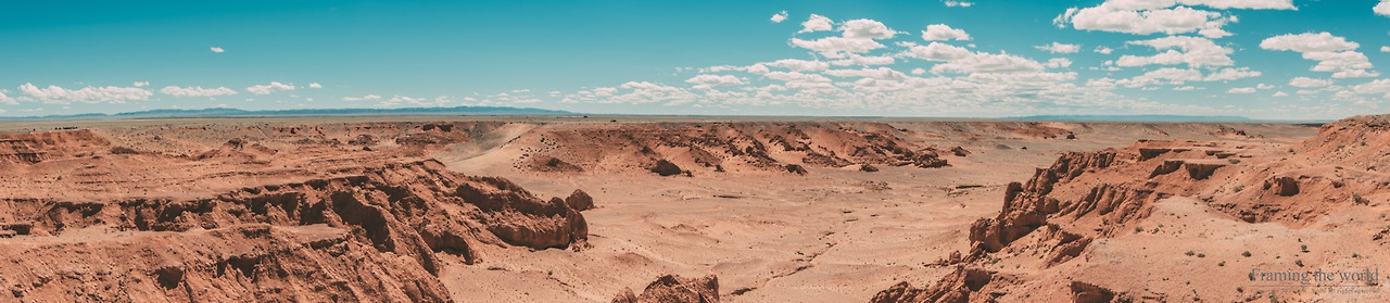 붉은 대지 위엔 비 맞은 옷에 생긴 진한 얼룩처럼 군데군데 그림자가 있었다. 나무 한그루, 빌딩 한 채 없는 이 곳에 생긴 저 그림자는 무엇일까 쳐다보다가 깨달았다. 그건 머리로는 알고 있지만 도시에선 제대로 볼 수 없었던 선명한 구름의 그림자였다. 빌딩과 사람과 미세먼지가 없는 그곳에서는 구름 그림자가 또렷해서 낯설게만 느껴졌다. 푸른 하늘에 프린팅 된 무늬 같은 하얀 구름과, 붉은 대지. 끝없는 수평선 한가운데에 덩그러니 놓인 절벽은 색채로, 수평과 수직의 선으로 강렬한 대비를 이루고 있었다. 차강 소브라가가 올록볼록한 곡선의 땅이었다면, 바얀작은 선이 굵은 직선의 땅이었다.