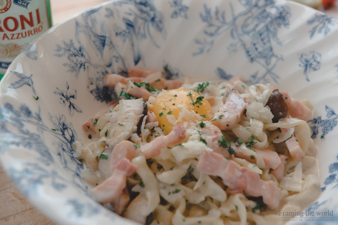 풍부한 맛과 향, 적절한 식감이 조화로운 바질페스토 뇨끼 외에도 나는 일행과 함께 까르보나라 파스타, 페퍼로니 피자를 함께 시켜 먹었다. 까르보나라는 예상과는 달리 이탈리아 정통 요리법이라고 흔히 불리는 노른자만 있는 파스타가 아닌 크림소스가 조금 곁들여져 나왔다. 그러나 뇨끼 뿐 아니라 파스타 면 역시 생면으로 뽑는 식당답게 파스타면 역시 만족스러운 식감을 보여줬다. 물론 파스타의 맛이 적절하게 조화로웠음은 물론이다. 흔하게 보기 힘든 두툼한 베이컨의 맛은 덤이었다.