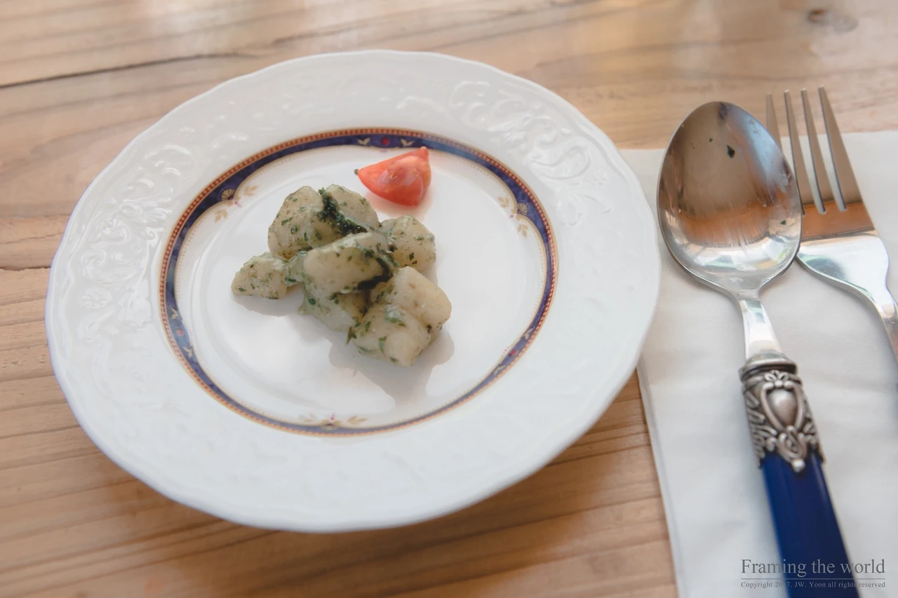 잘 하는 이탈리안 레스토랑에 대한 기준은 사람마다 무척 다양하겠으나, 개인적으로 나는 우리나라에서는 이탈리아식 수제비라고 흔히 알려진 뇨끼를 기준으로 삼는 편이다. 뇨끼는 감자와 밀가루를 섞어 반죽해 만드는 감자뇨끼(Gnocchi di patata)가 가장 유명한데, 우리가 흔히 먹을 수 있는 뇨끼의 80% 이상은 전부 감자뇨끼라고 해도 될 것이다. 이 뇨끼라는 것이 반죽을 직접 만들어야 하고, 그마저도 상당히 까다로운 탓에 주방장이 자신이 없다면 메뉴에 올라오지 않는 것이 보통이다. 그래서 기본적으로 메뉴판에 뇨끼가 있는 이탈리안 레스토랑이라면 평균 이상은 한다고 생각해도 괜찮다. 이건 나름의 꿀팁 아닌 꿀팁이랄까.
