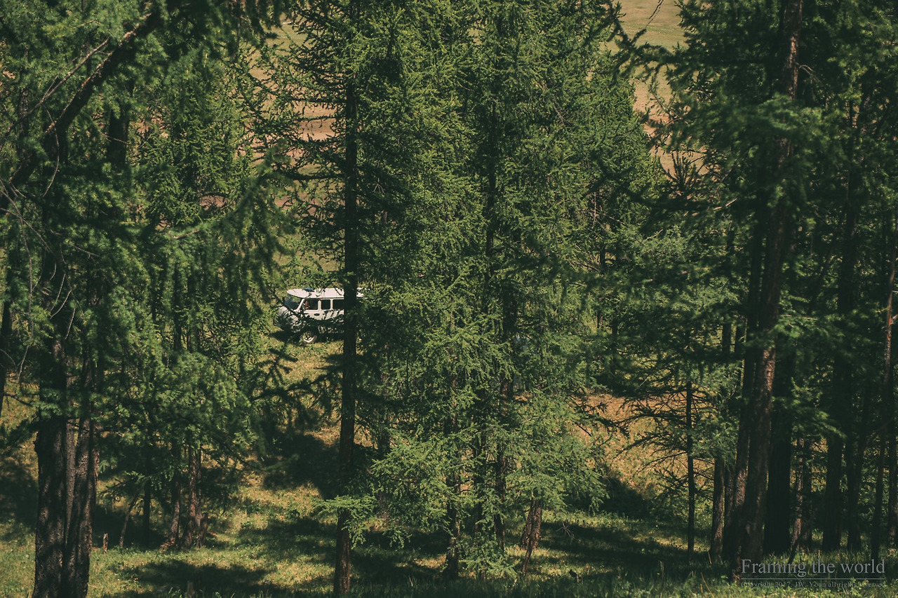 우리가 북쪽으로 향할수록 온도는 점점 더 내려갔다. 해가 뉘엿뉘엿 질 때쯤이 되면, 기온은 우리나라의 초가을 정도로 바뀌었다. 우리는 더 늦기 전에 온천을 할 준비를 마치고 기다리던 온천을 하러 향했다. 물론 나는 발만 담글 예정이었으므로 샤워 도구만 대충 챙겼다. 꽤나 제대로 된 샤워시설이 갖춰진 샤워장은 오랜만이었다. 나는 온천에 발만 살짝 담갔다가, 온천을 즐기고 있는 일행들을 뒤로하고 다시 게르로 돌아왔다. 게르에서 바로 내다 보이는 숲을 보러 갈 생각이었다.