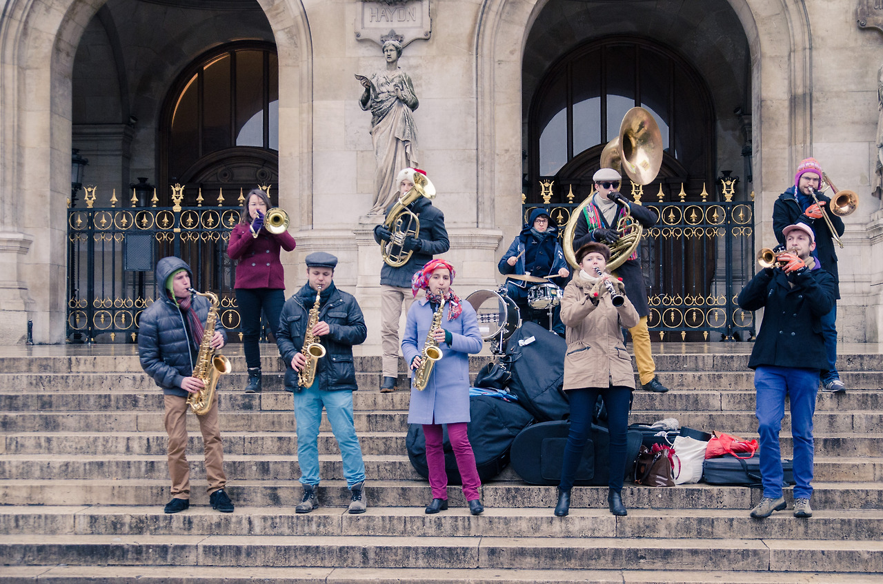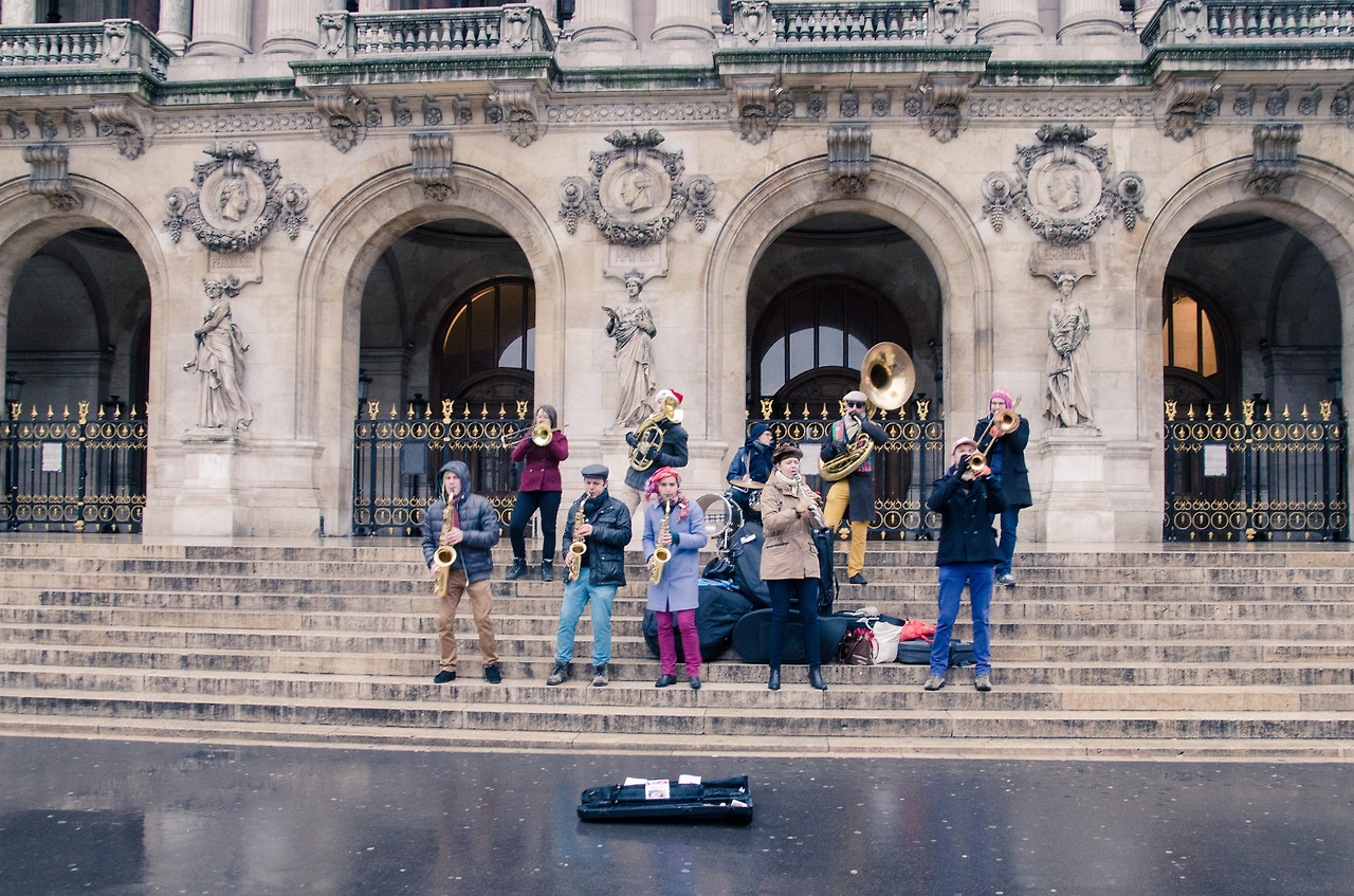샤를 가르니에에 의해 지어진 오페라 가르니에(Opéra Garnier 혹은 가르니에 궁 Palais Garnier)는 오페라와 발레 공연 등이 주를 이루는 파리의 국립 오페라 극장이었다. 가난한 배낭여행자였던 나는(예매도 하지 않았지만) 당연하게도 안에서 열리는 공연을 볼 수 없었다. 그러나 무작정 찾아간 오페라 가르니에 앞에서, 나는 뜻하지 않은 공연을 마주할 수 있었다. 그건 한 브라스 밴드의 버스킹 공연이었다.