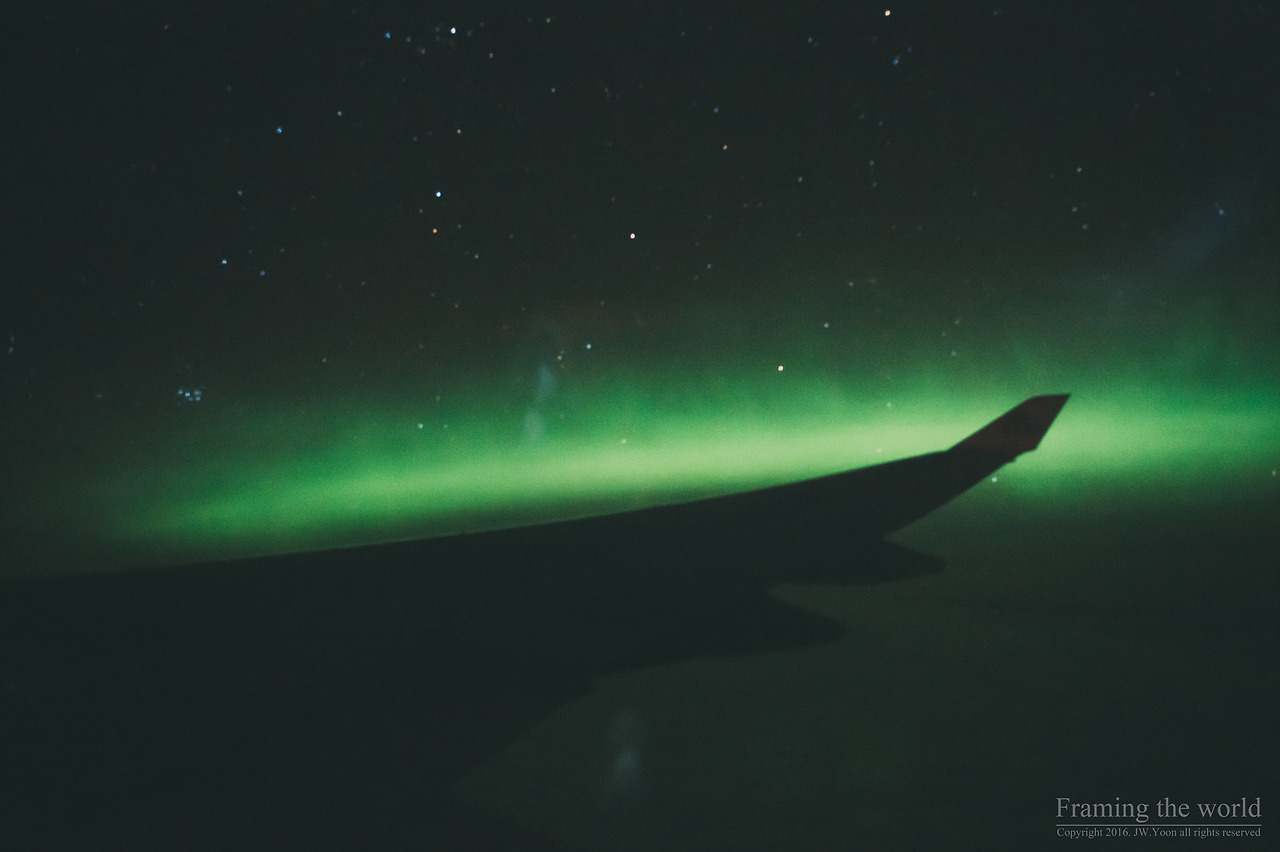 나는 급히 카메라를 켜고 사진을 찍었다. 믿을 수 없는 광경이었다. 혹시나 싶어 앞좌석에 붙어 있는 모니터를 확인해봤다. 화면에선 내가 탄 비행기가 러시아 위를 날아가고 있음을 보여주고 있었다. 극지방에서만 볼 수 있다는 오로라임에 틀림없었다. 언젠가 꼭 보고 싶었던 오로라와 이런 식으로 첫 대면을 하게 되리라곤 꿈에도 생각하지 못했다. 창밖으로 보이는 오로라는 우아하고 부드러웠으며 신비로웠다. 마치 우주 속을 비행하고 있는 것만 같았다.