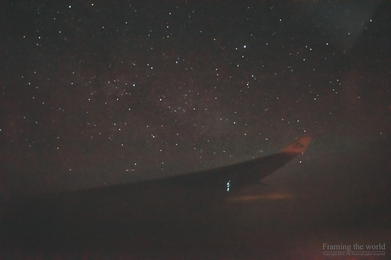 별이었다. 창밖으로 수많은 별이 어지럽게 반짝이고 있었다. 언젠가 어릴 적 보았던 가평의 밤하늘이 생각났다. 그날의 밤하늘에도 빼곡하게 별이 박혀 있었다. 기내에선 웅웅-거리는 비행기 엔진의 소음만이 빈 공간을 메우고 있었다. 깨어있는 듯 잠든 시간들이 지나갔다. 그렇게 영화 한편을 보고, 선 잠에 들었다 깼다를 반복했지만 여전히 시간은 느리게 흘러가고 있었다. 그리고 다시 한번 반짝이는 별을 보고자 창밖으로 시선을 돌렸을 때, 나는 내 눈을 의심했다.