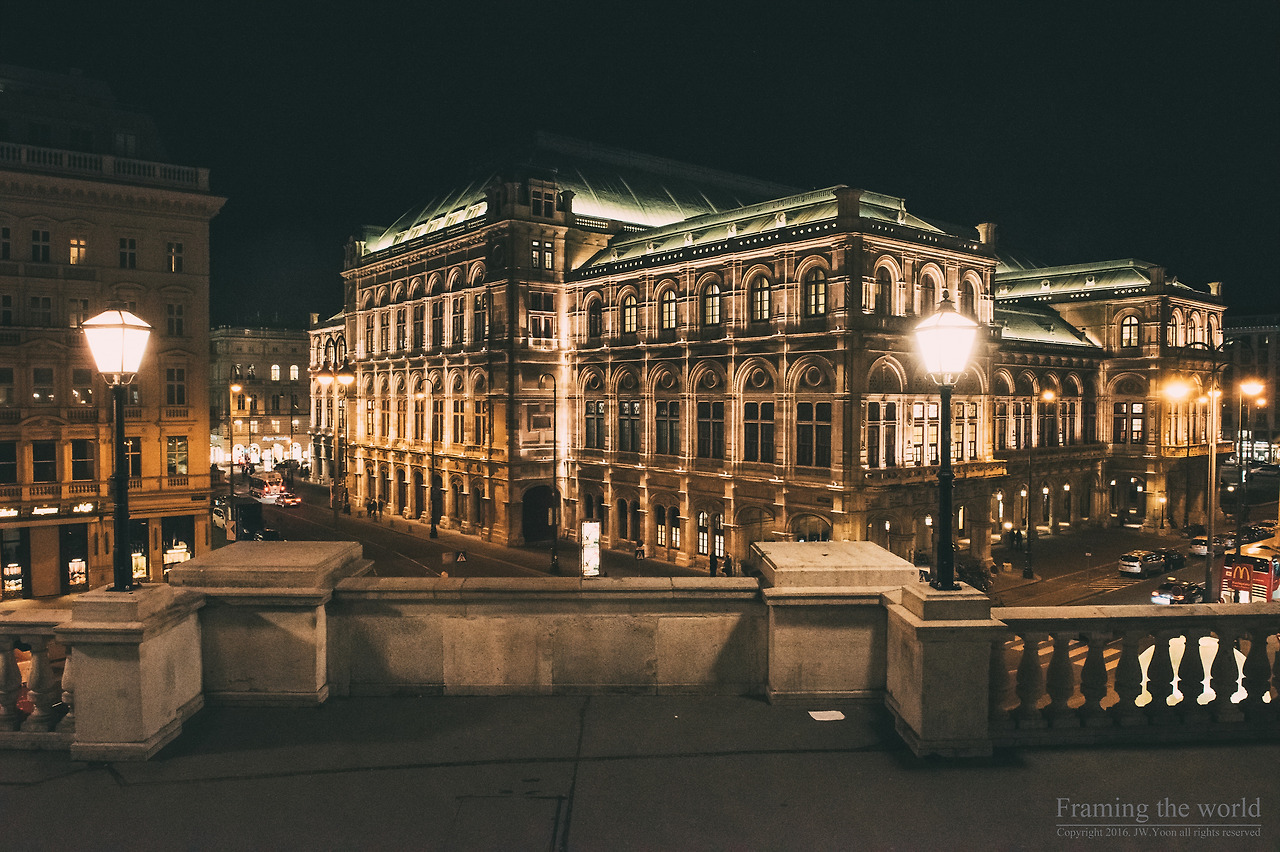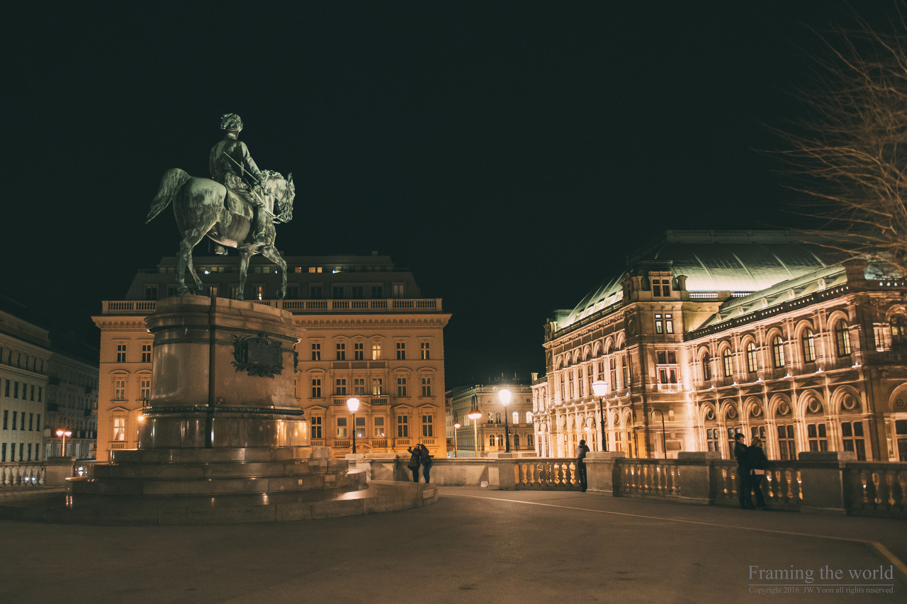 빈의 가장 유명한 랜드마크는 바로 국립 오페라극장이다. 유럽에서도 음악의 도시로 알려진 빈의 국립 오페라극장은 파리 오페라 가르니에, 밀라노 스칼라 극장과 함께 유럽 3대 오페라 극장으로 꼽히는 곳이다. 아름다운 외관뿐 아니라 내부 역시 각종 그림과 장식들로 화려하게 꾸며져 있다고 하는데, 아쉽게도 내부에는 들어가 보지 못했다. 오페라극장은 빈 시내 중심의 번화가에 위치하고 있어 사람이 많을 거라 생각했으나, 한 밤 중의 알베르티나 광장은 한산했다. 그곳엔 열 명도 채 안 되는 사람들이 저마다 오페라극장을 보며 생각에 잠겨있었다.