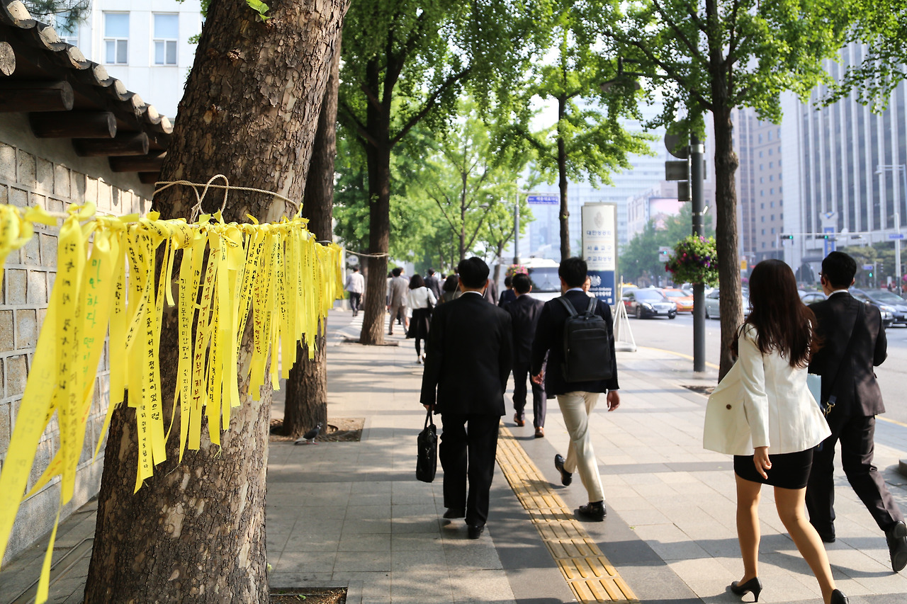 사건이 있은지 한 달이 지난 어느날, 여느때와 다름없이 출근을 하던 길에 노란색 리본들이 눈에 들어왔습니다. 그리고 그 옆을 바쁘게 지나가던 사람들도 보였습니다. 그날따라 참 복잡한 감정들이 마음속을 헤집어놓았습니다. 그렇게 카메라를 들고, 사진을 찍었습니다. 세월호와 관련된 유일한 사진이었죠.