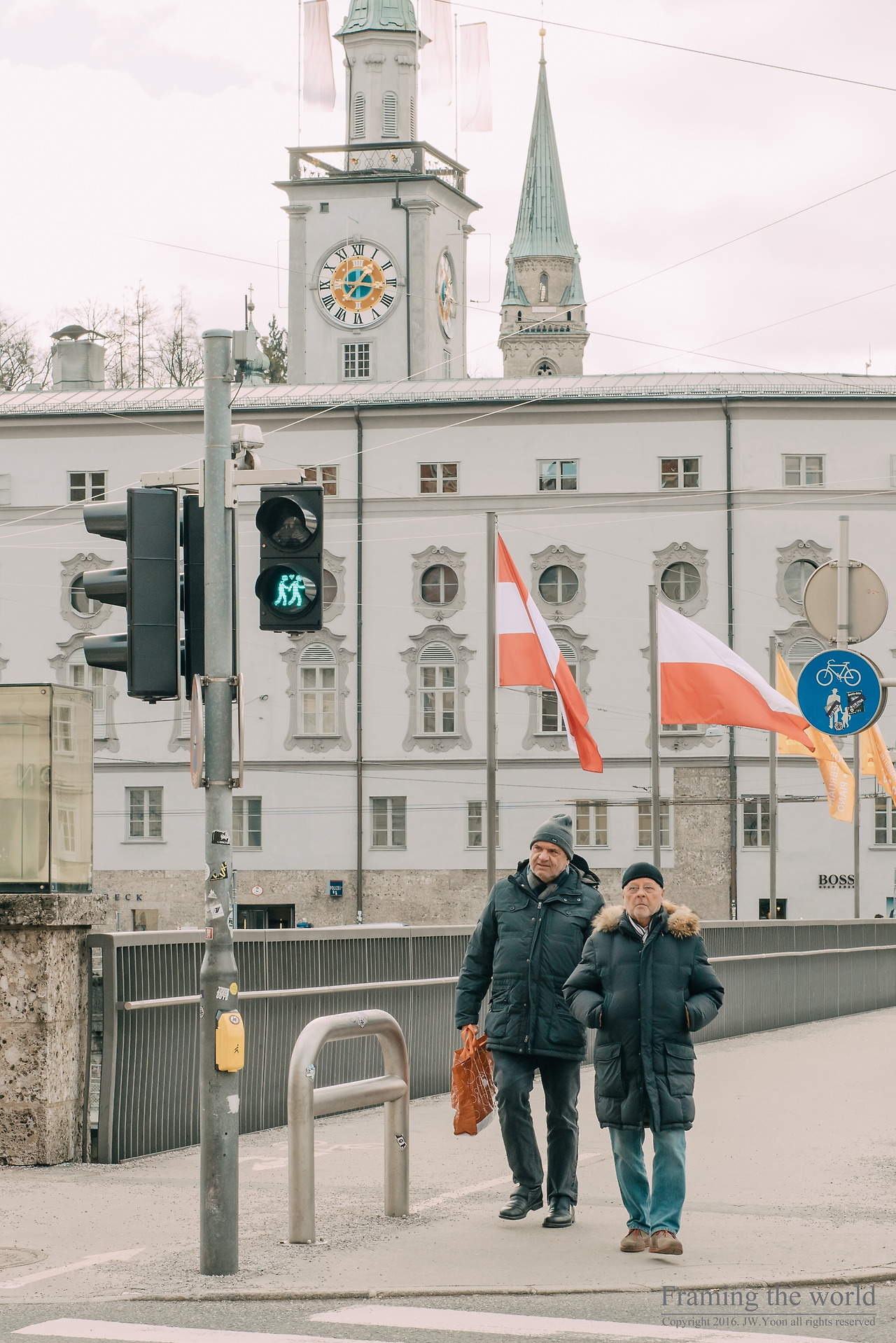 잘츠부르크는 요새라는 이름에 걸맞게 웅장하고 빈틈없는 인상을 주던 호엔잘츠부르크를 제외하면 아기자기하고 소박한 인상을 주는 도시였다. 그리고 도시 곳곳에 귀엽게 설치된 각종 픽토그램은 도시를 걸어 다니며 관찰할 수 있는 또 하나의 재미였다. 특히 신호등 불빛은 때론 커플이 다정하게 걷는 모습으로, 때론 자전거를 타고 있는 사람이 서 있는 모습으로 빛나고 있었다. 작지만 꽉 들어찬 느낌을 주는 도시였다.
